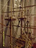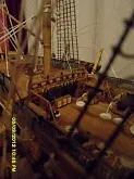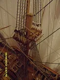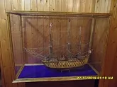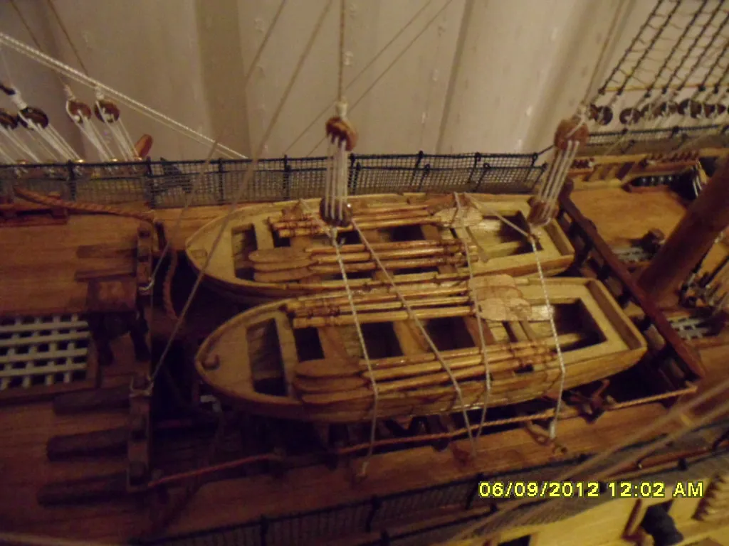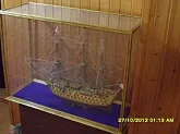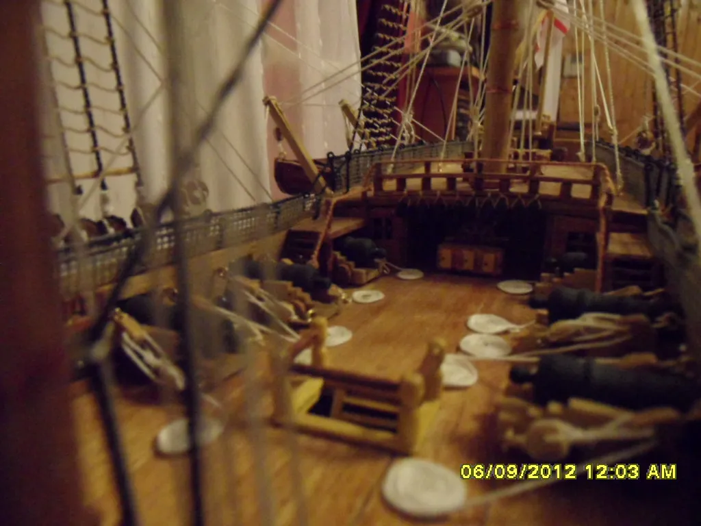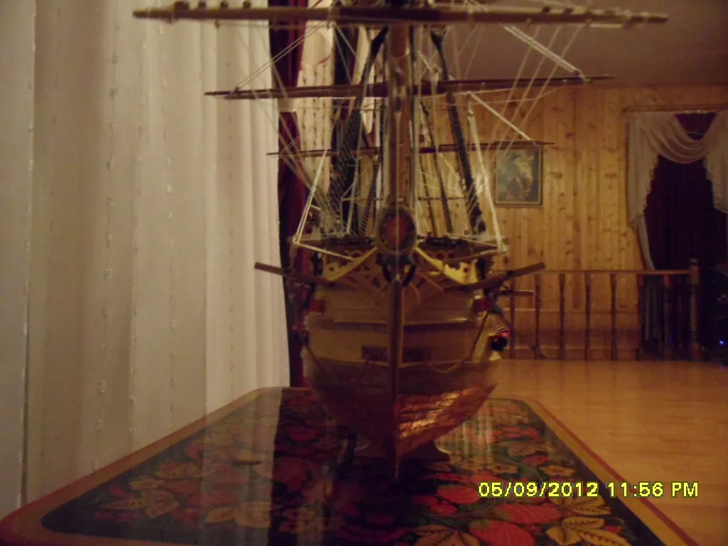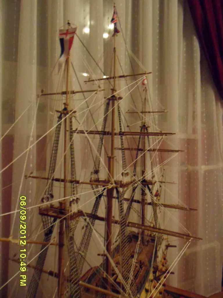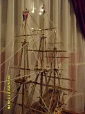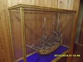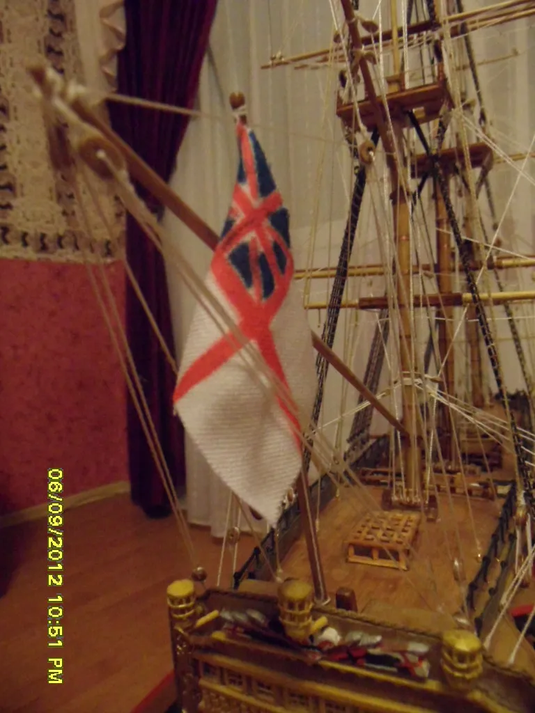Модель построена полностью с нуля. При изготовлении использовал чертежи бумажной модели. Для постройки пользовался только ручным инструментом (кроме дрели). Из материалов использовал в основном фанеру 4 мм. Пушки выточены из дерева, днище обшито медью. Это моя первая модель, делал ее два года.