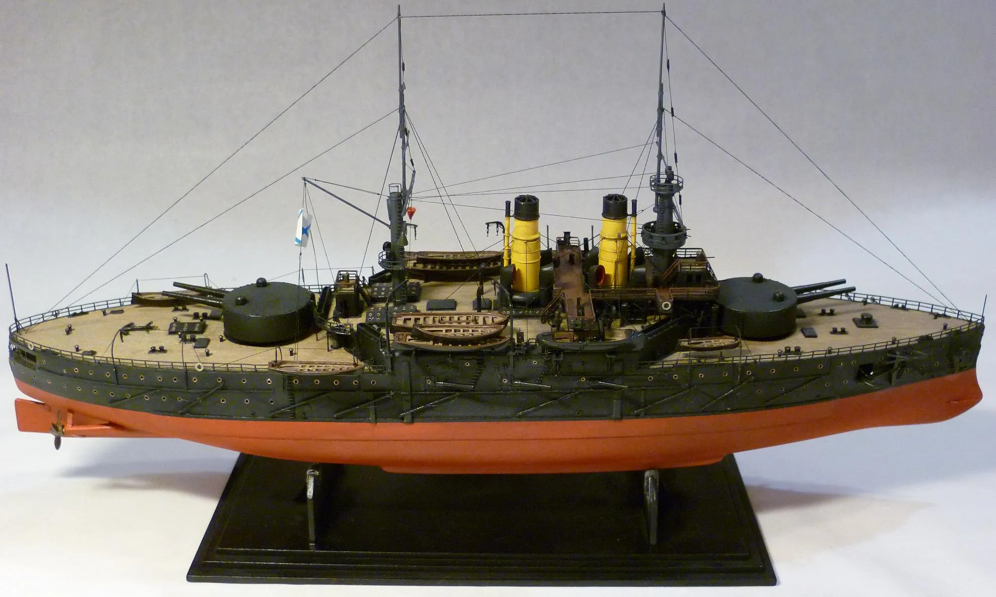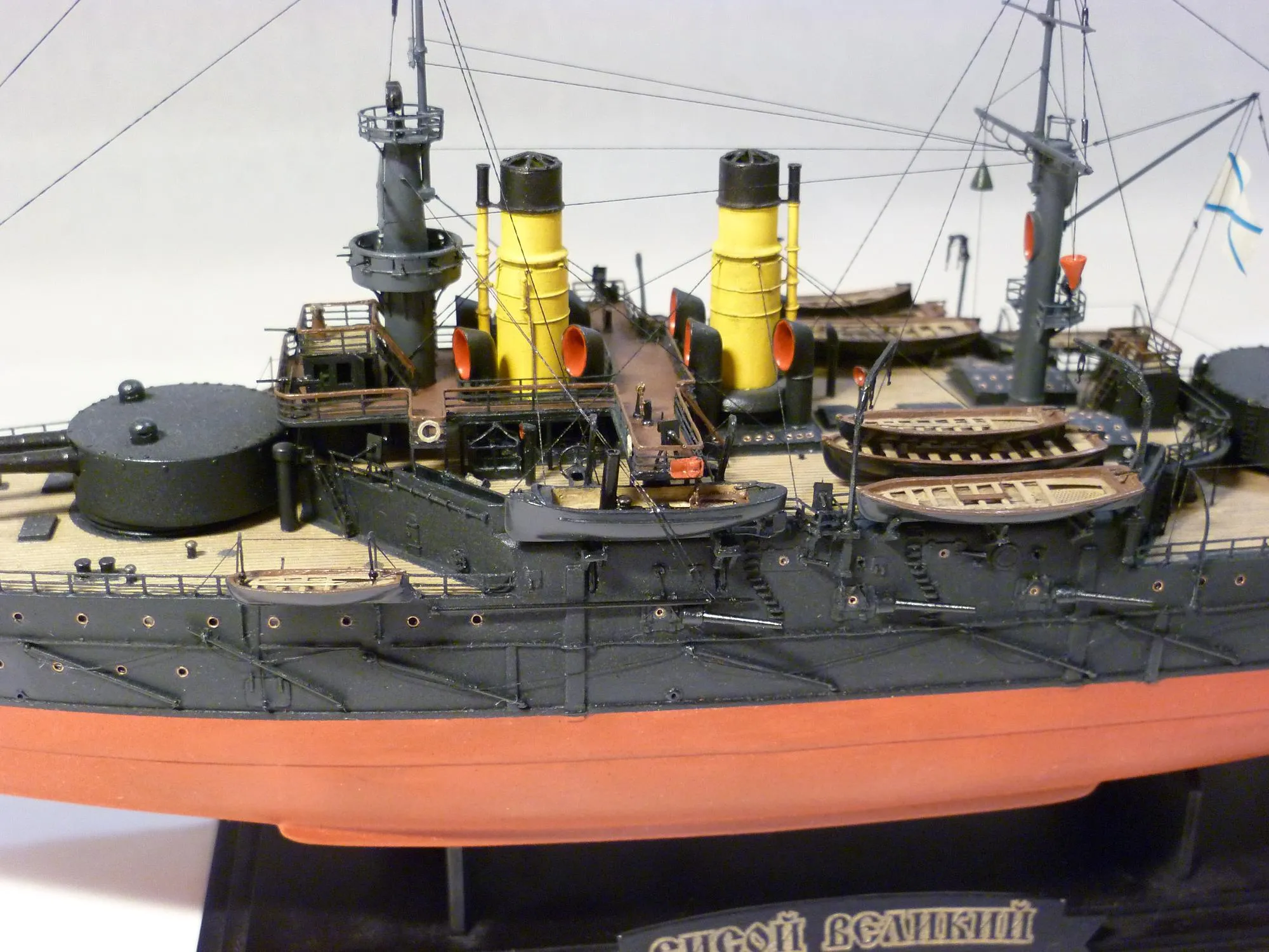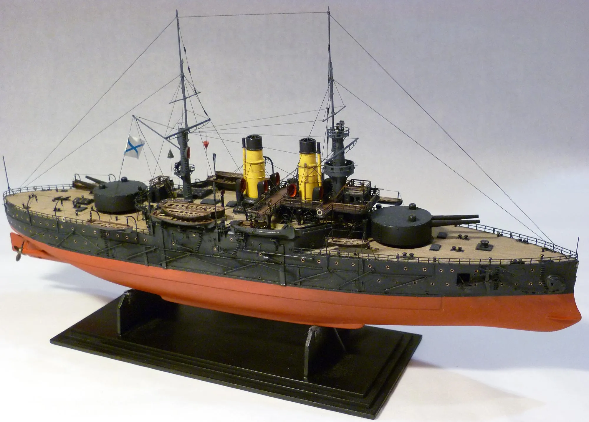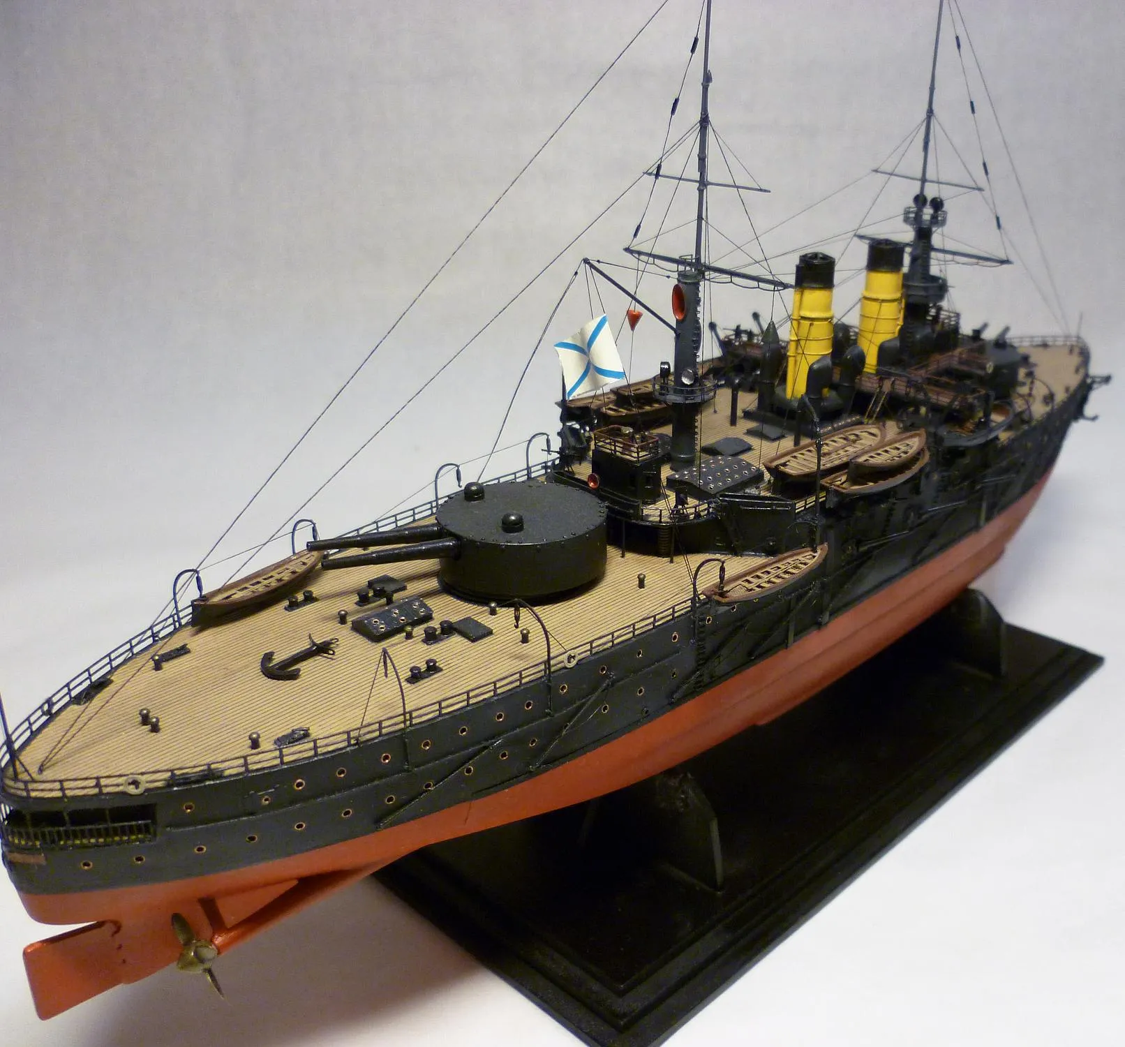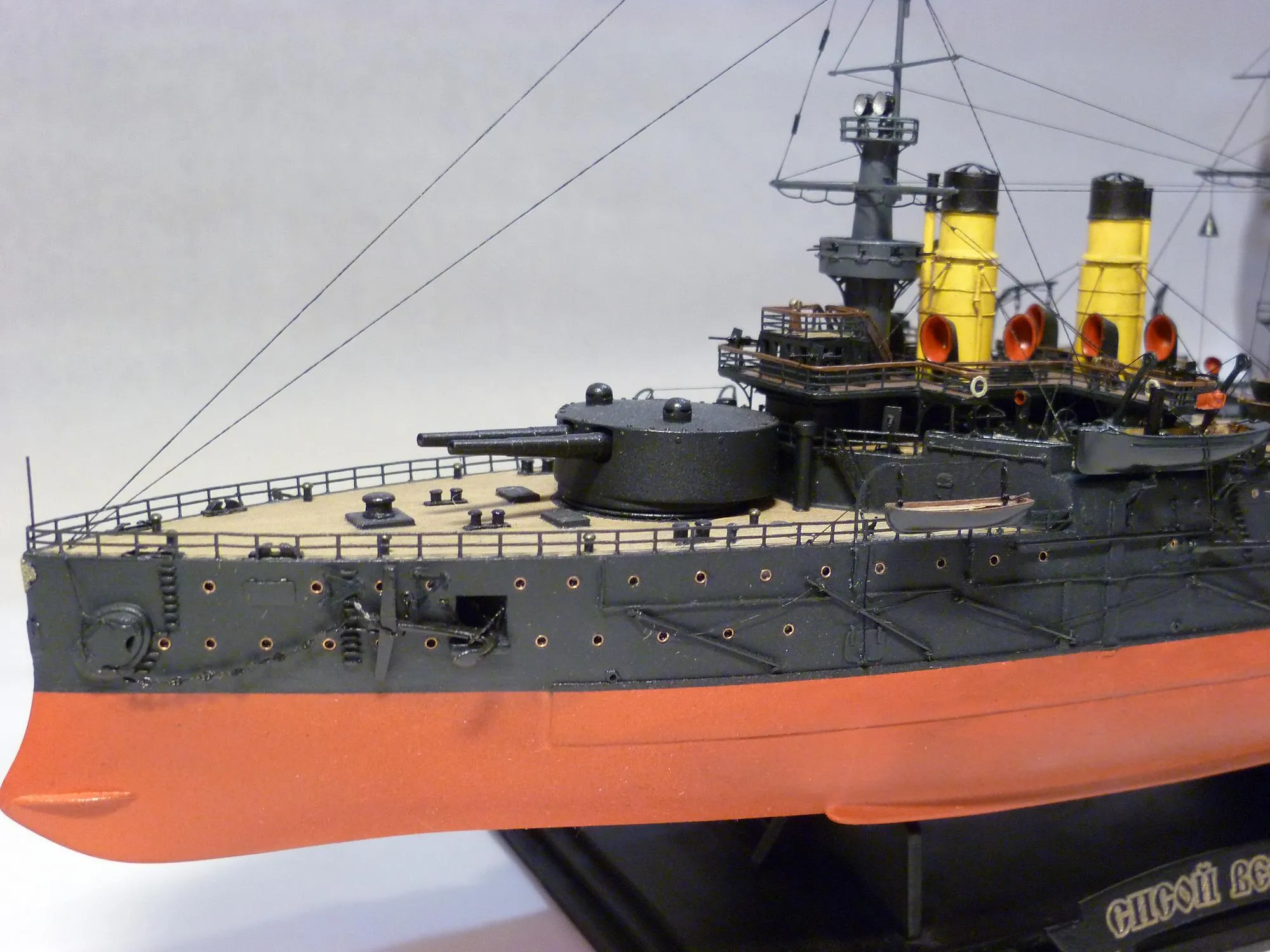 Модель создавалась на период осени 1904 г. в момент отплытия 2 Тихоокеанской эскадры к театру военных действий на дальний восток. Выполнена модель из коробки с авторскими доработками по чертежам г.А.Логинова и фотографиям оригинала.