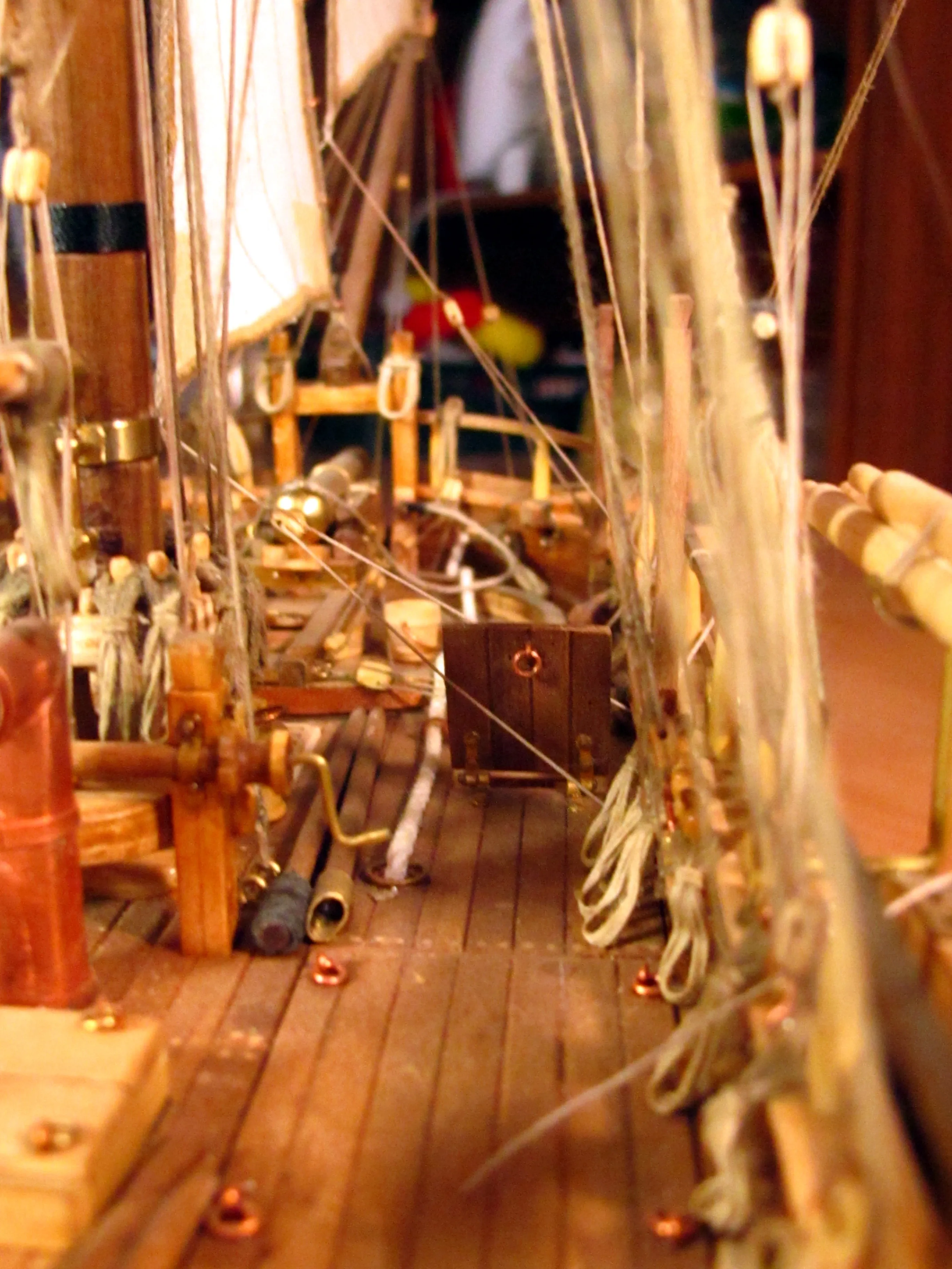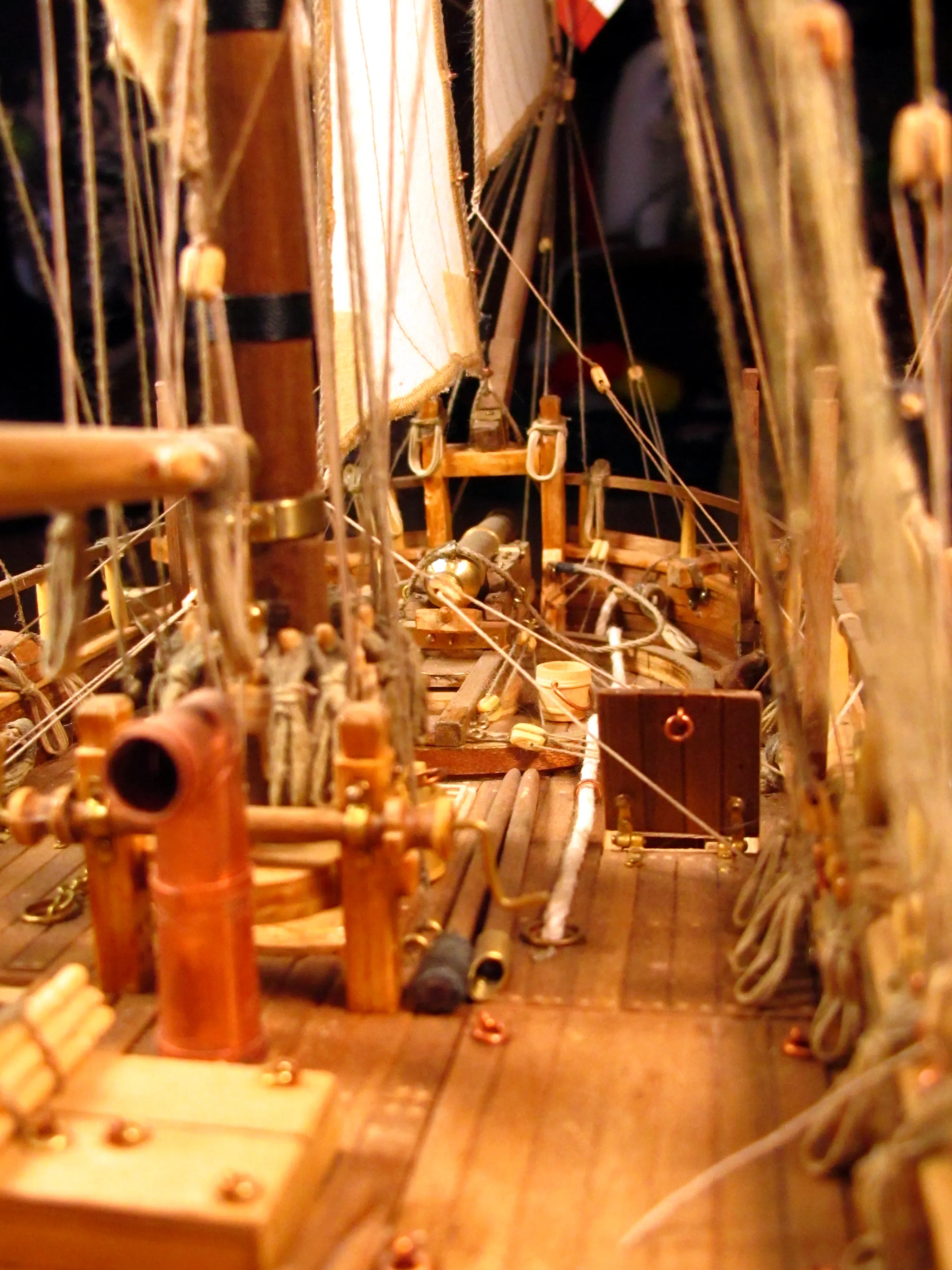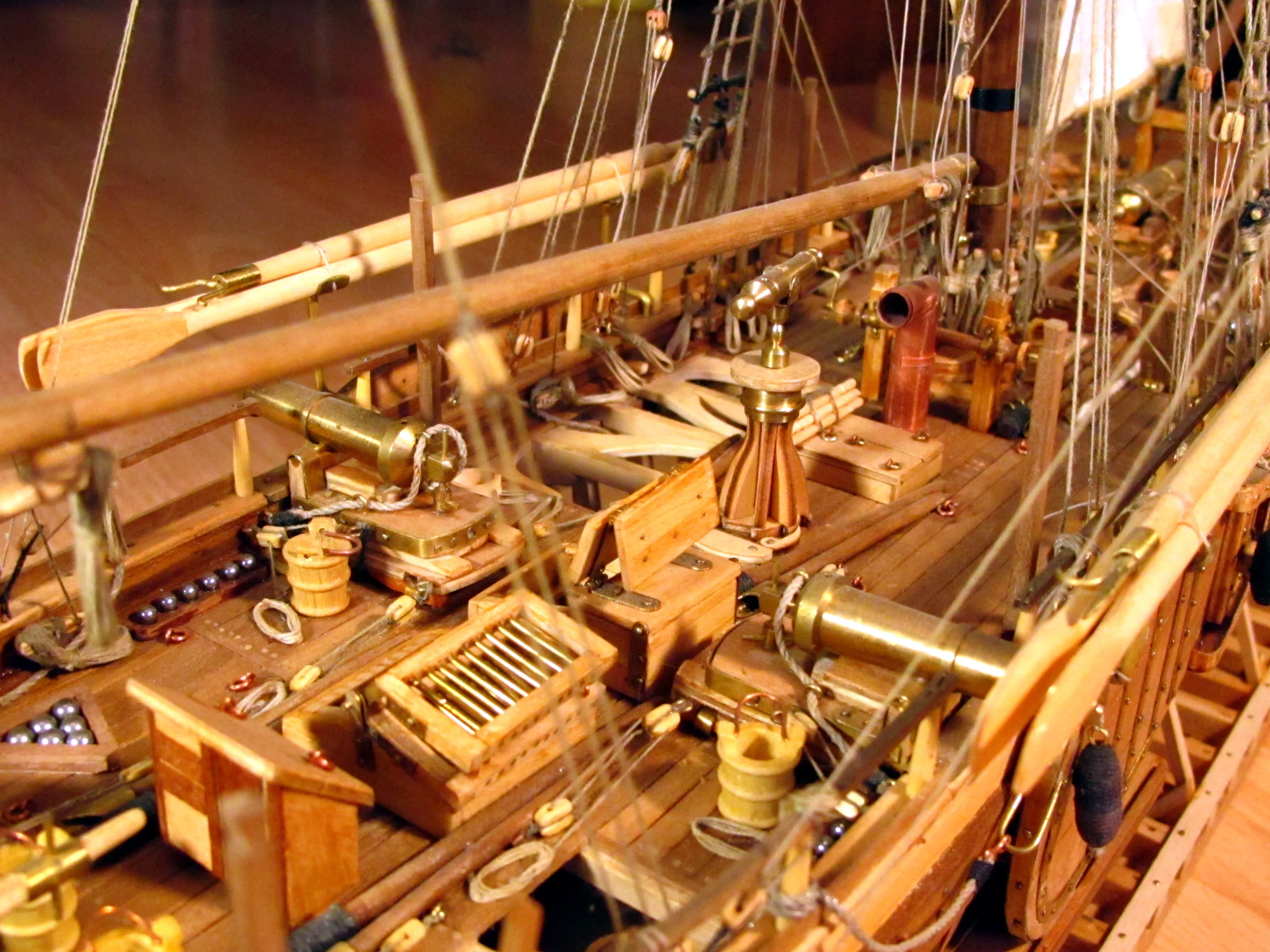 Палуба выполнена со съемными щитами, чтобы видеть "внутренности" (лестницы, перегородки, двери с петлями и ручками, бочки, печки и т.д.).