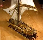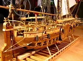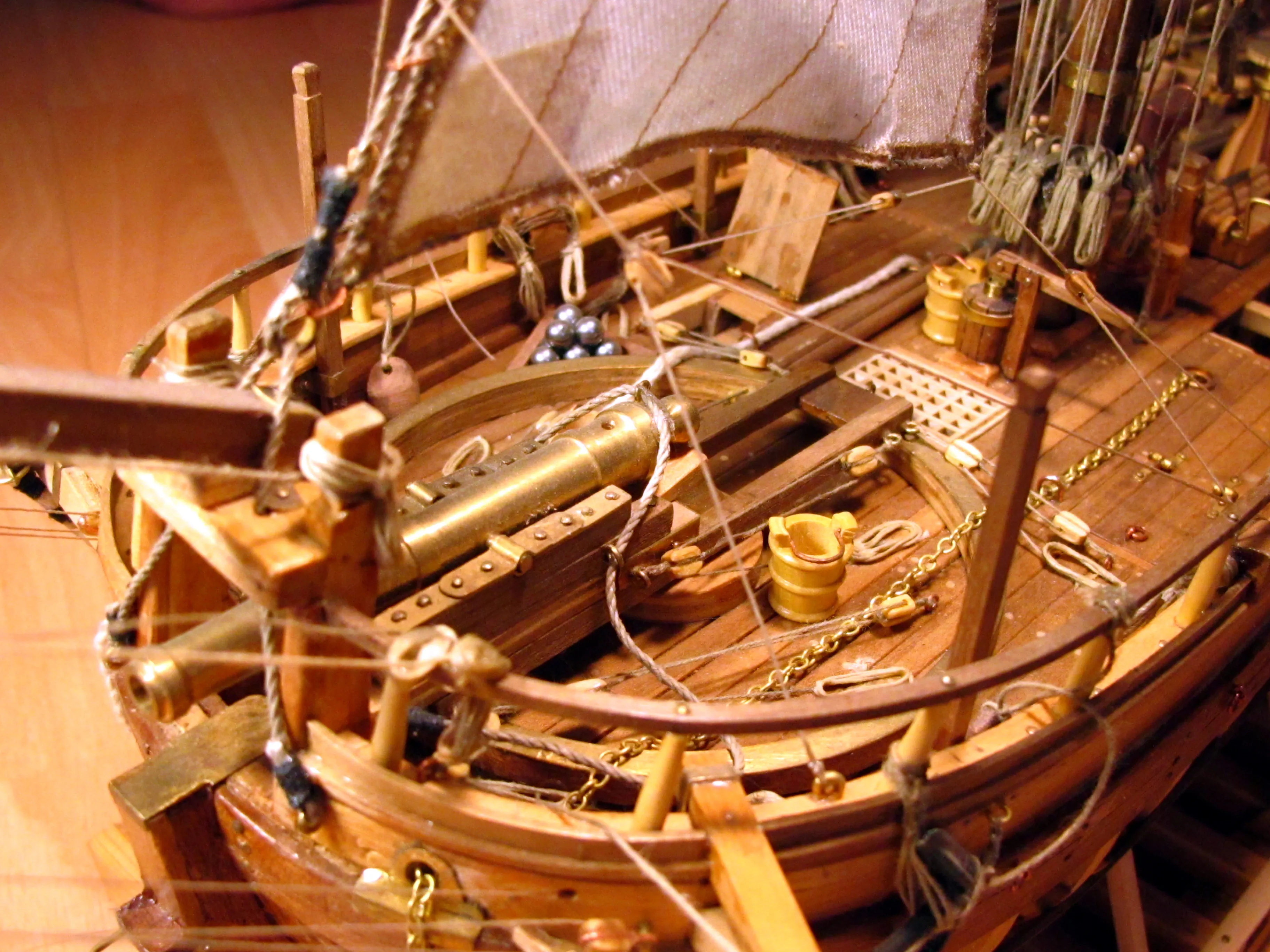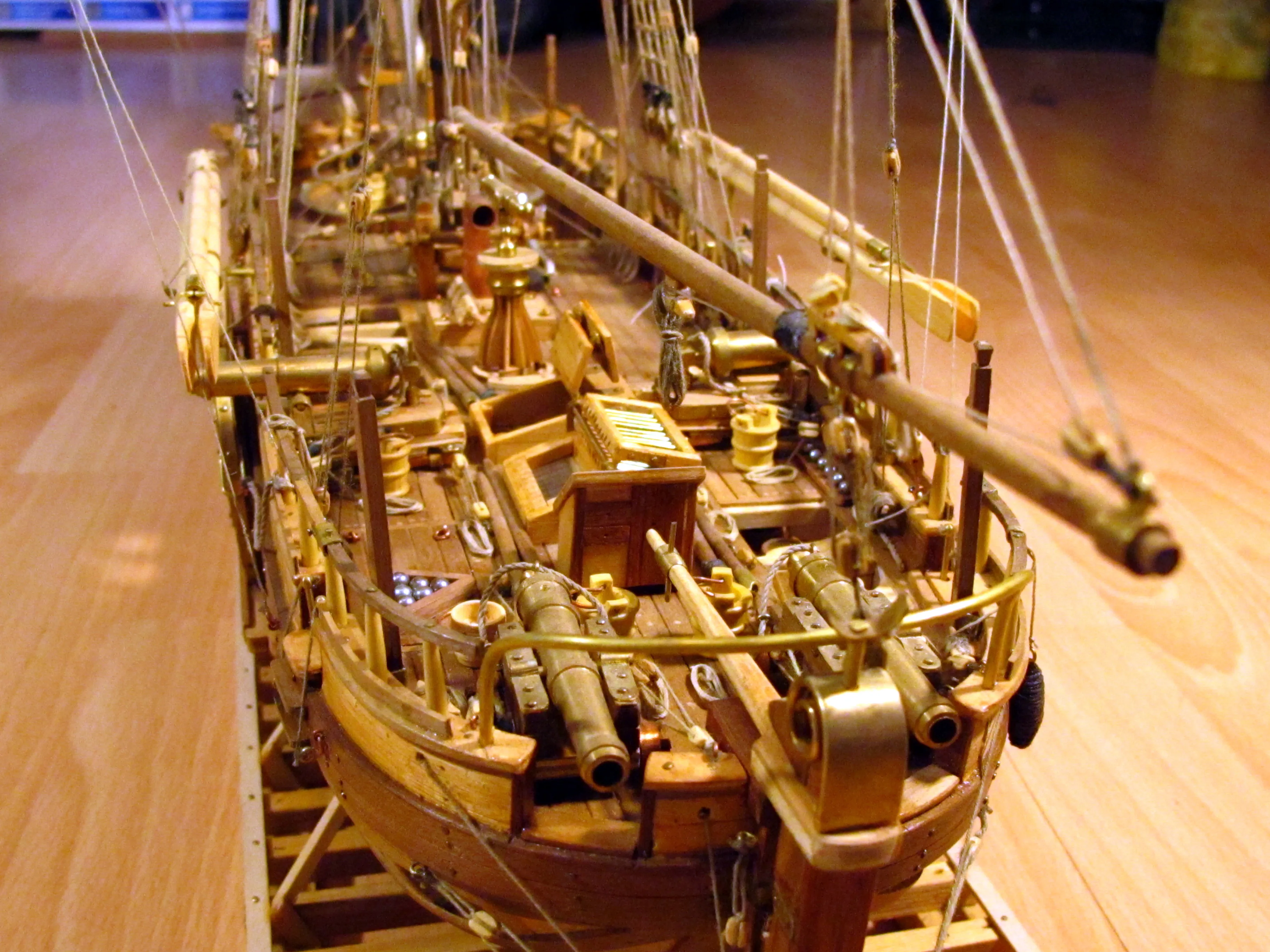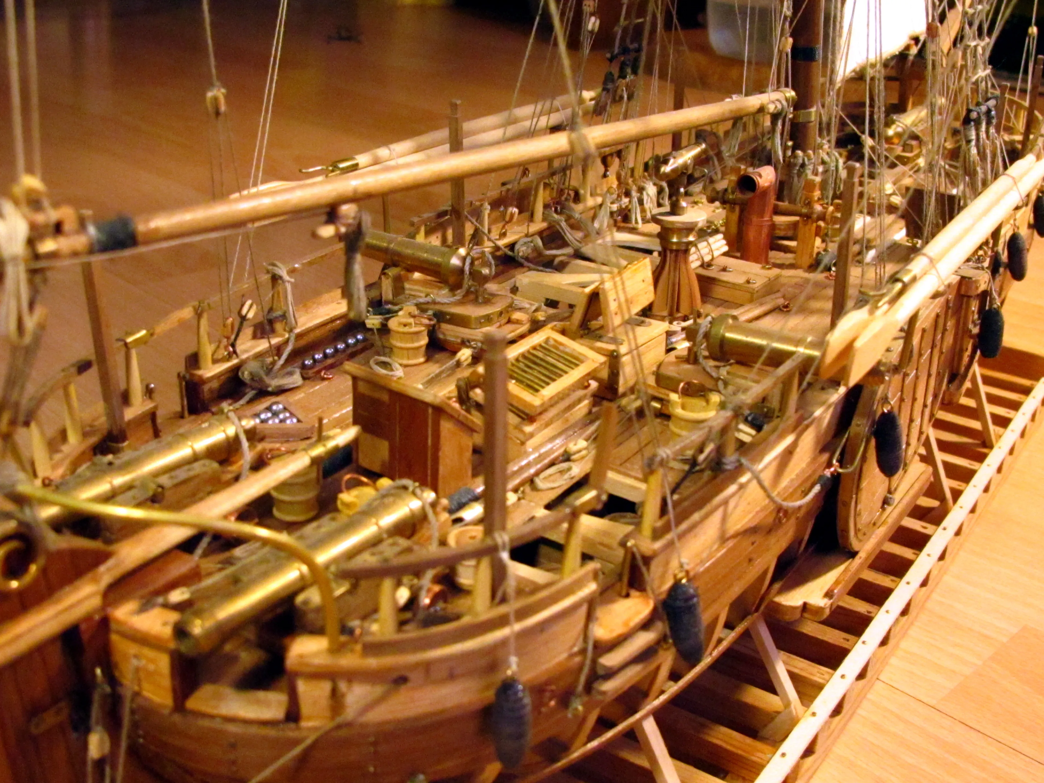 Палуба выполнена со съемными щитами, чтобы видеть "внутренности" (лестницы, перегородки, двери с петлями и ручками, бочки, печки и т.д.).
