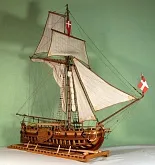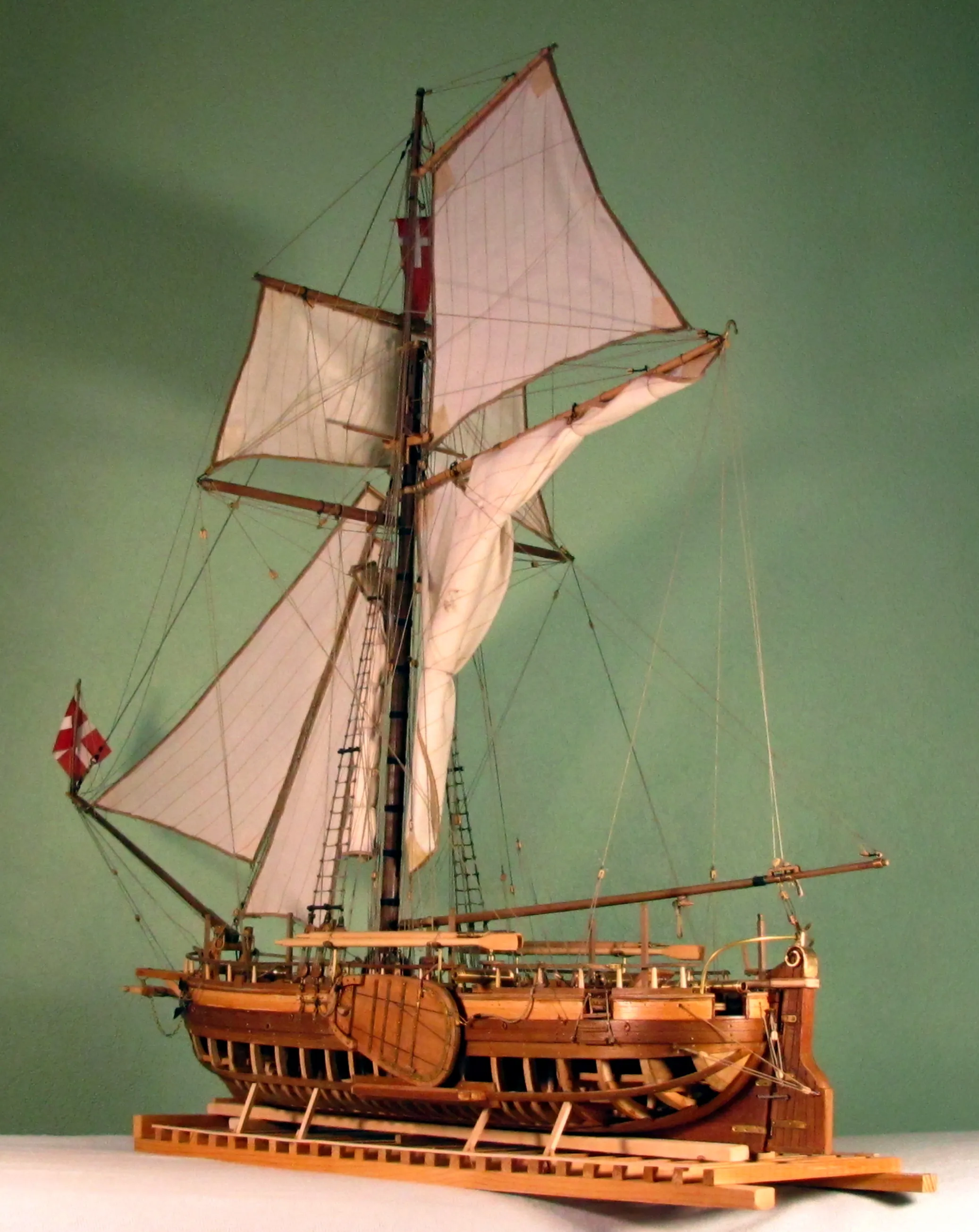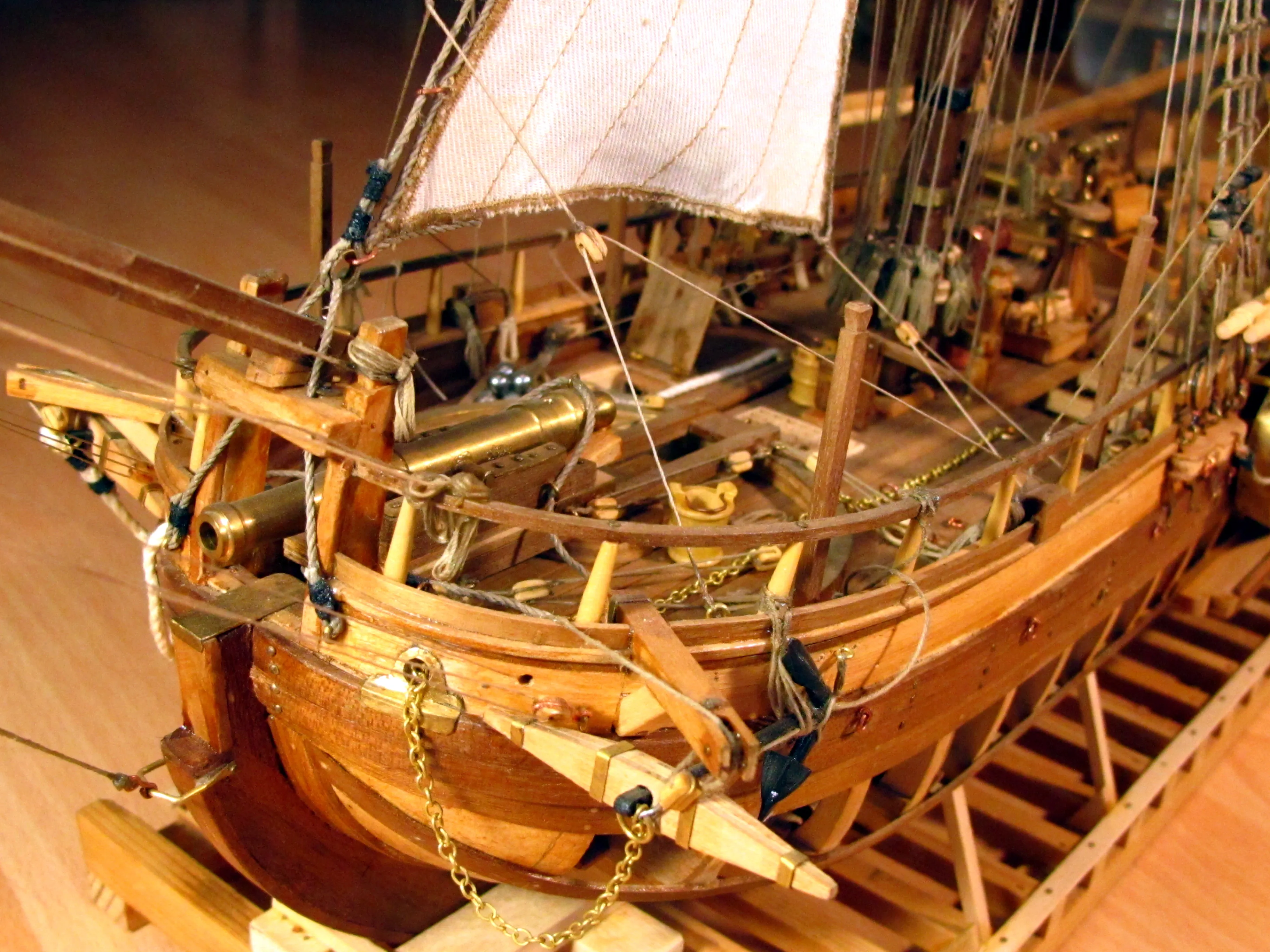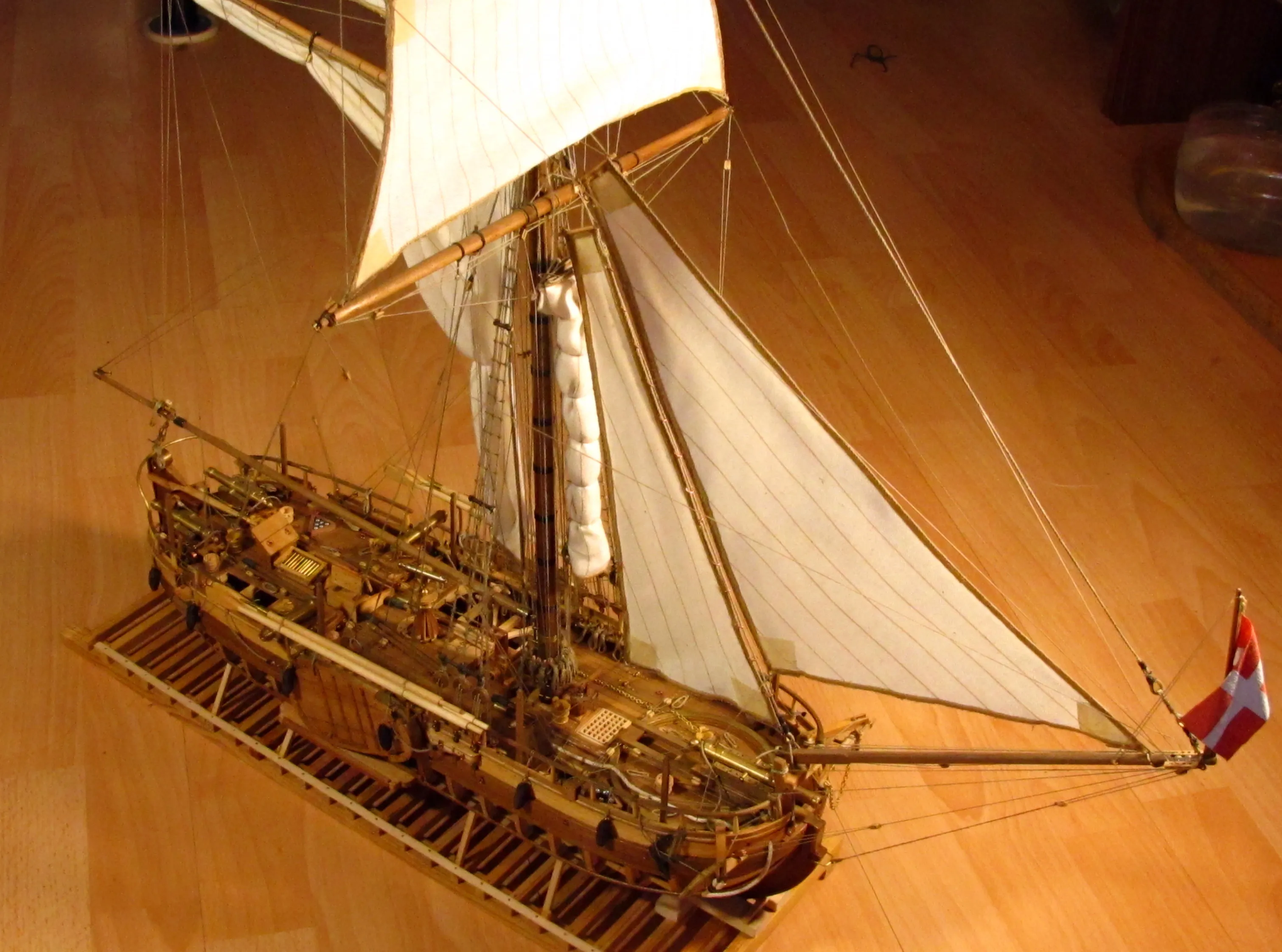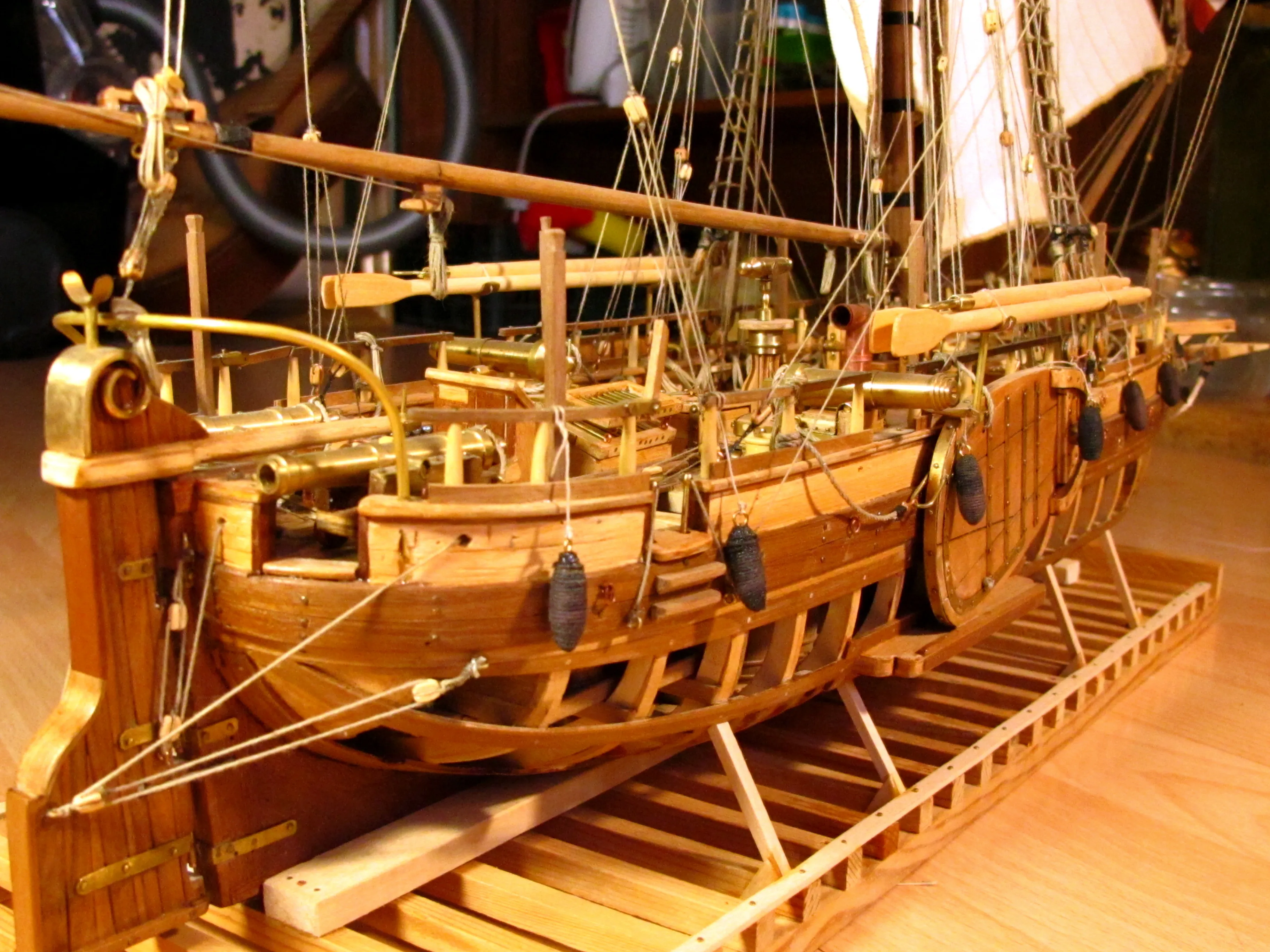 Паруса покупные, из вашего магазина. Немного модернизировал (усилил углы, обшил). При проводке такелажа трудностей не возникло. Чертежи достаточно подробные.