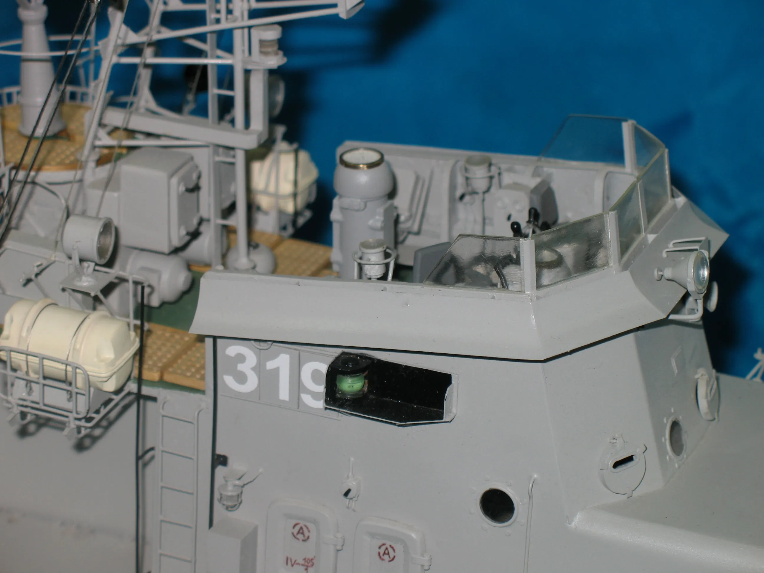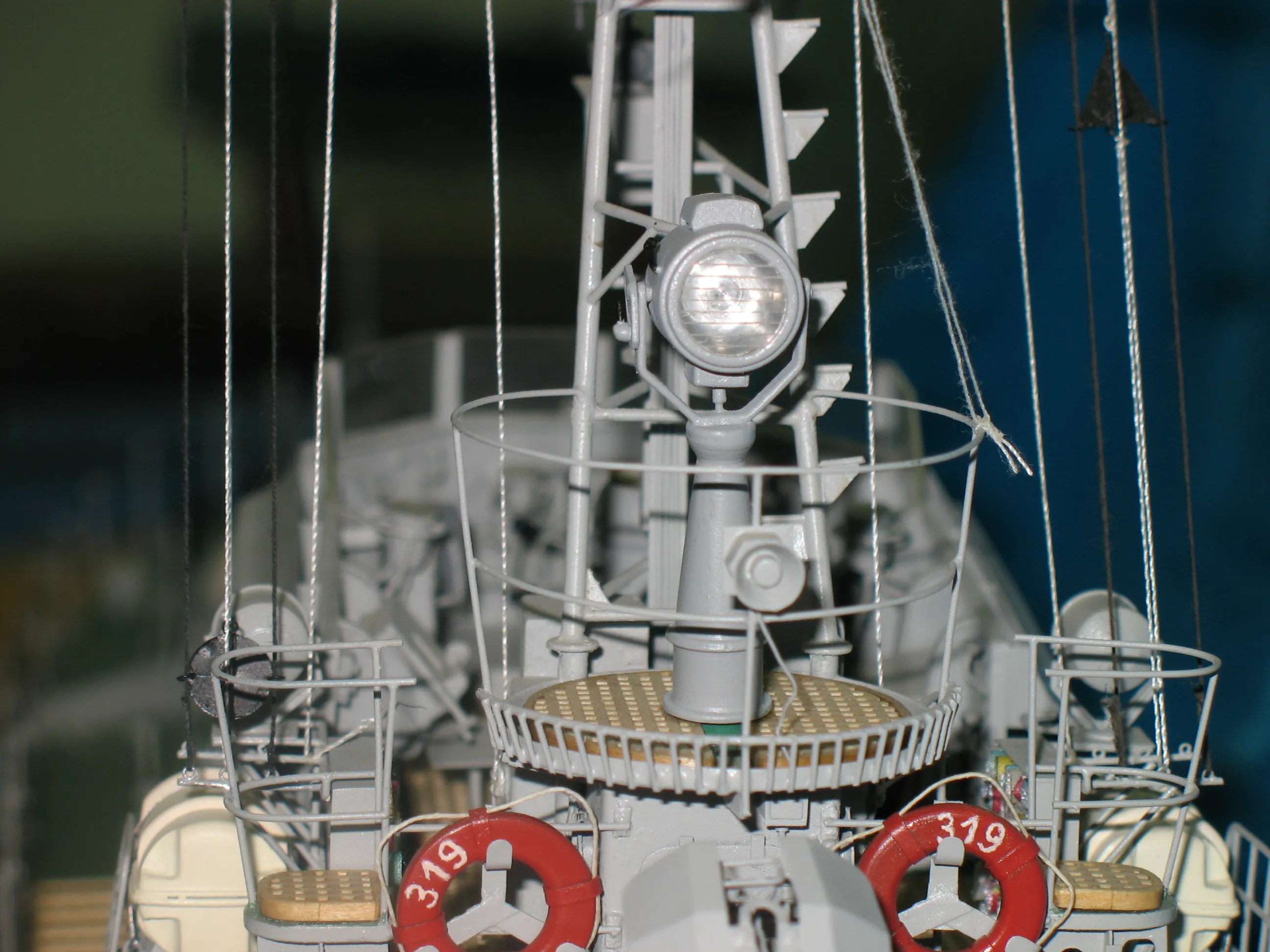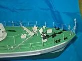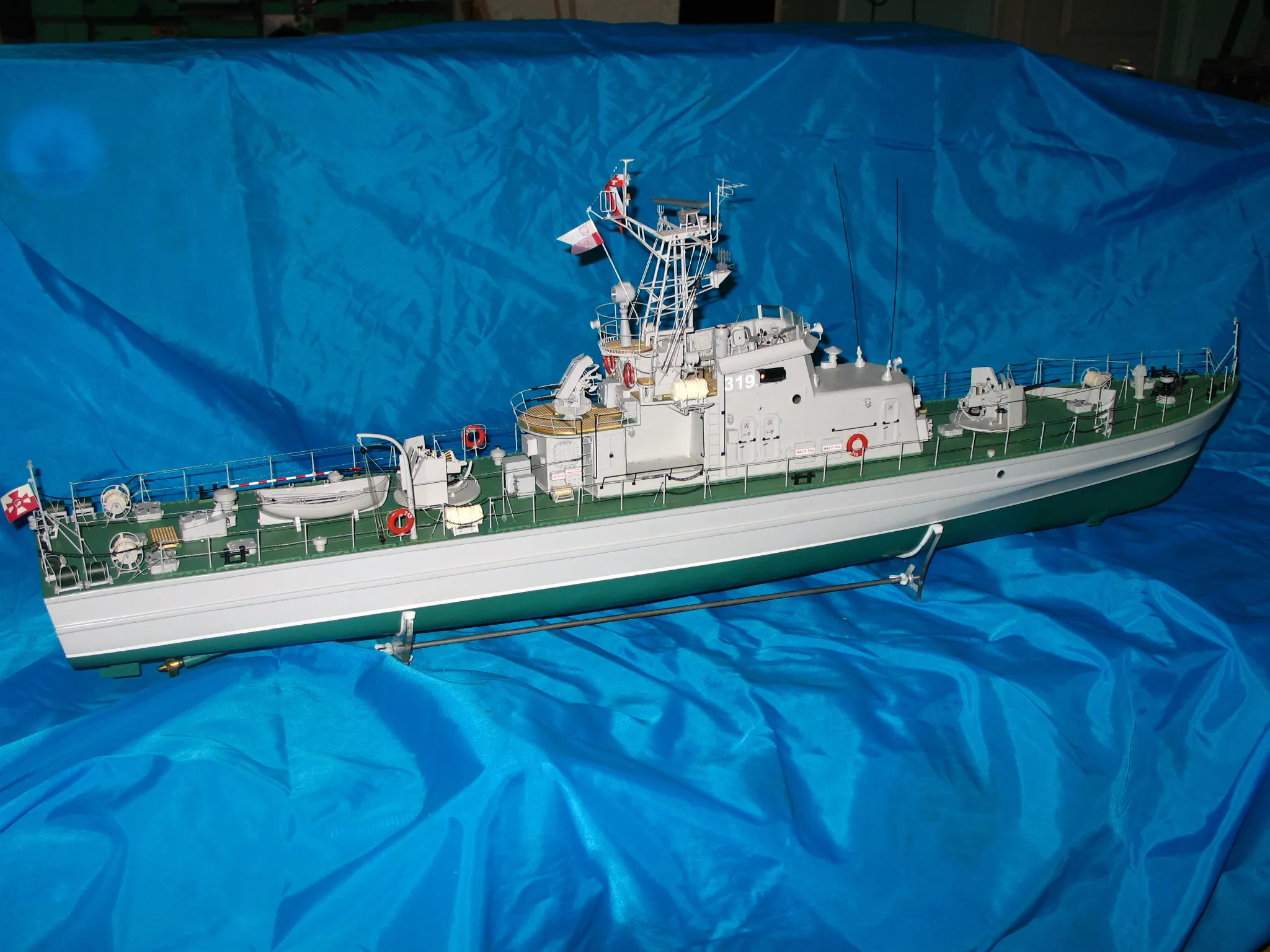 Модель строилась для участия в сореснованиях в классе Ф2Б. Масштаб 1:40. Чертежи из журнала Модельбау-хойте (http://forums.airbase.ru/2009/06/t67481--chertezhi-patrulnogo-katera-tipa-gdansk-polnisces-patrouille.html). корпус стеклопластик. Палуба стеклотекстолит. Рубка, главные орудия из жести. Применялся пластик пвх, целлулойд, акрил, дерево, пленка оракал ( на палубе). Швы делал из нитрокраски - резал тонкие полоски чуть подсохшей краси и приклеивал их на корпус, где на спирт, где на ацетон. Затем свехрху финишная покраска тоже нитро. Силовая установка - два двигателя Спид 400. Для флагов применялась термотрансферная бумага с последующим переносом изображения на ткань.