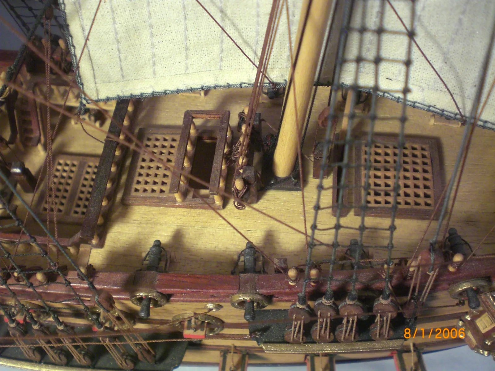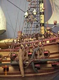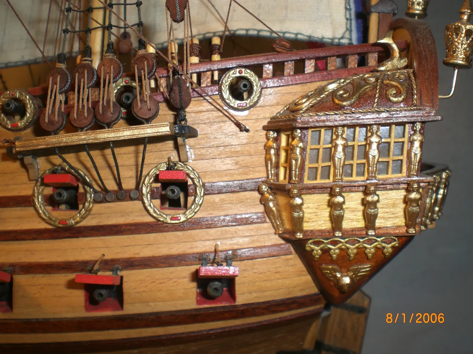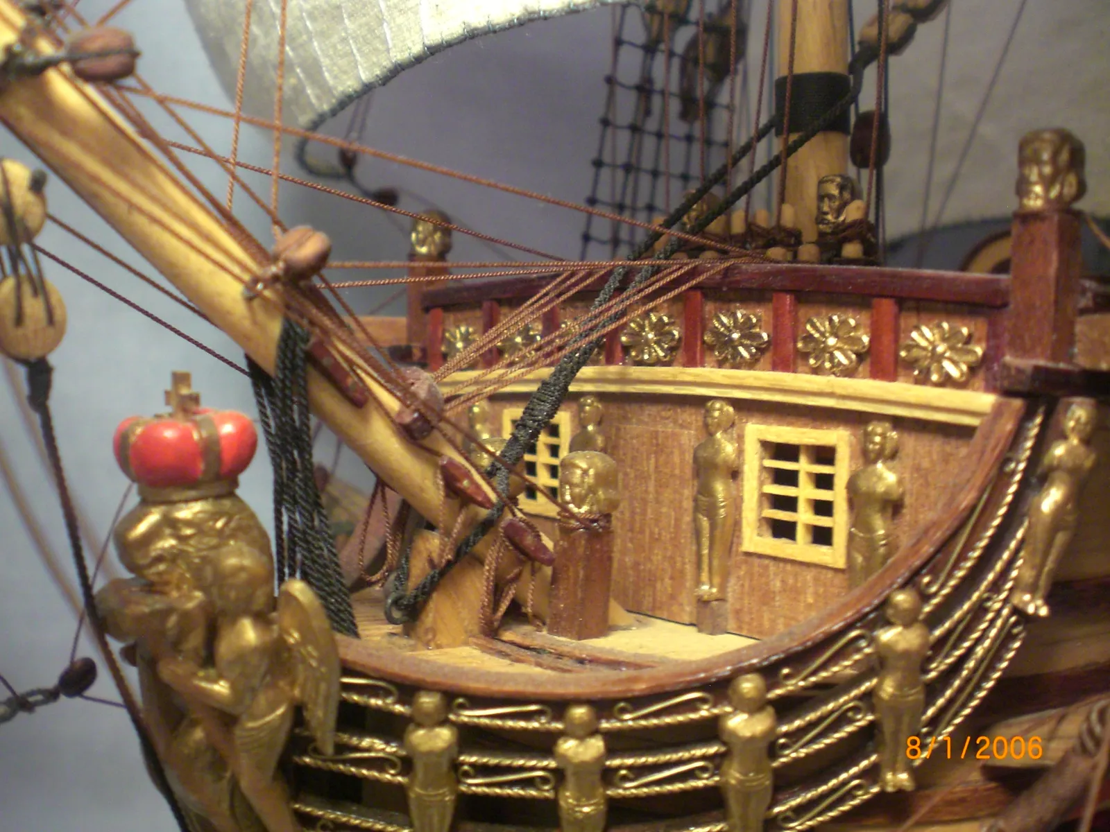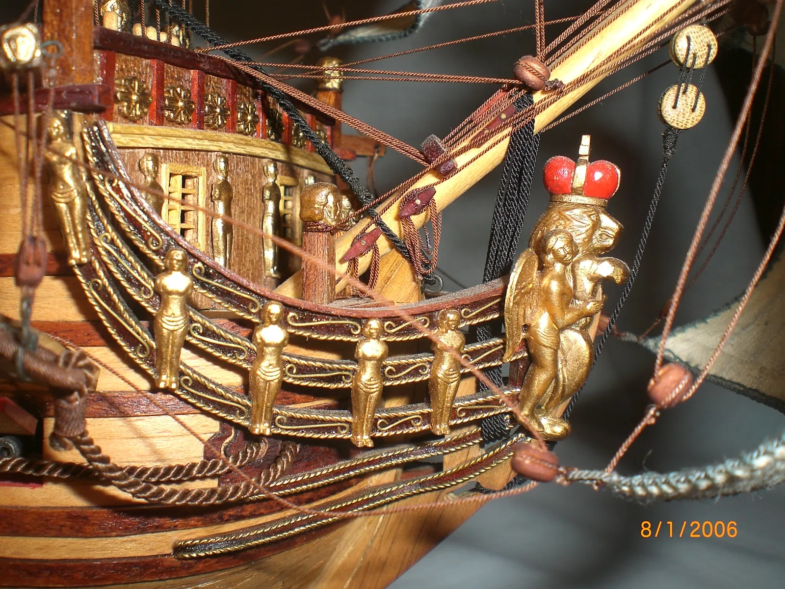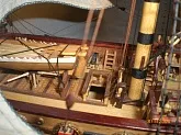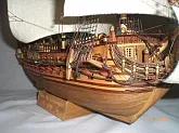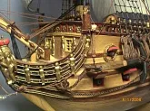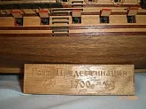 Масштаб 1:96.При постройке использовались польские чертежи,М-К и как наглядный пример-пластиковый набор "Огонек",из него же взята большая часть декора.Корона льва,дельфины и завитки на офицерском гальюне изготовлены самостоятельно.Покрашены золотой нитрокраской "Hobby". Борта снаружи-верх:шпон буковый,низ:дубовый.Палуба-рамин,борта внутри-шпон из журналов "Cан Джованни Батиста".Остальное-липа,ольха,красное дерево.Пушки точены из дерева и покрыты лаком с графитом.Такелаж навит из полиэфирных ниток.Бегущий такелаж бежевого цвета,покрашен спиртовой морилкой "красное дерево"Паруса льняные-нравится материал.Полотно напоминает парусину.Мачты и реи из рамина.На дату внимания не обращайте-Фотик завис на дате выпуска.Закончено в сентябре 2012.