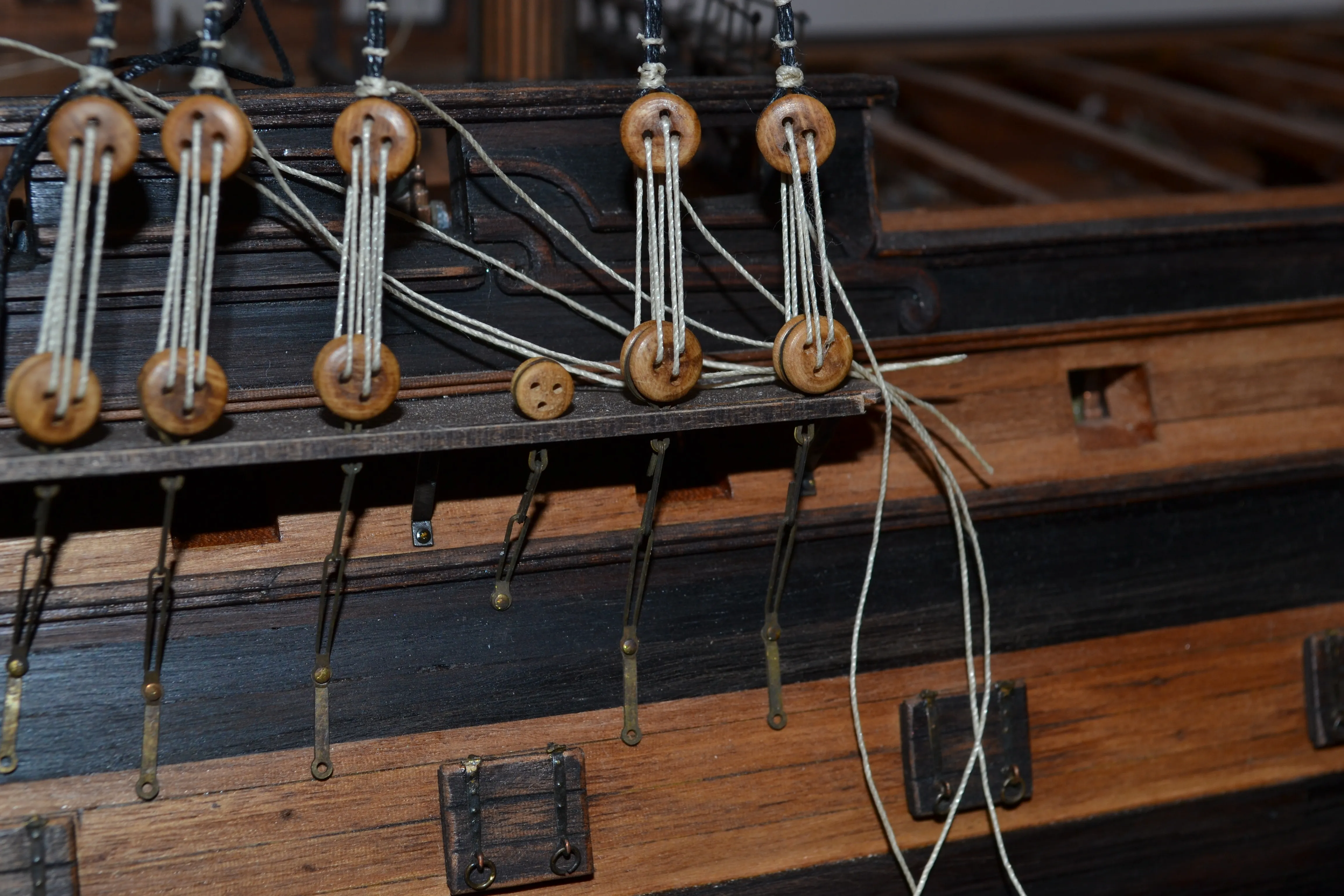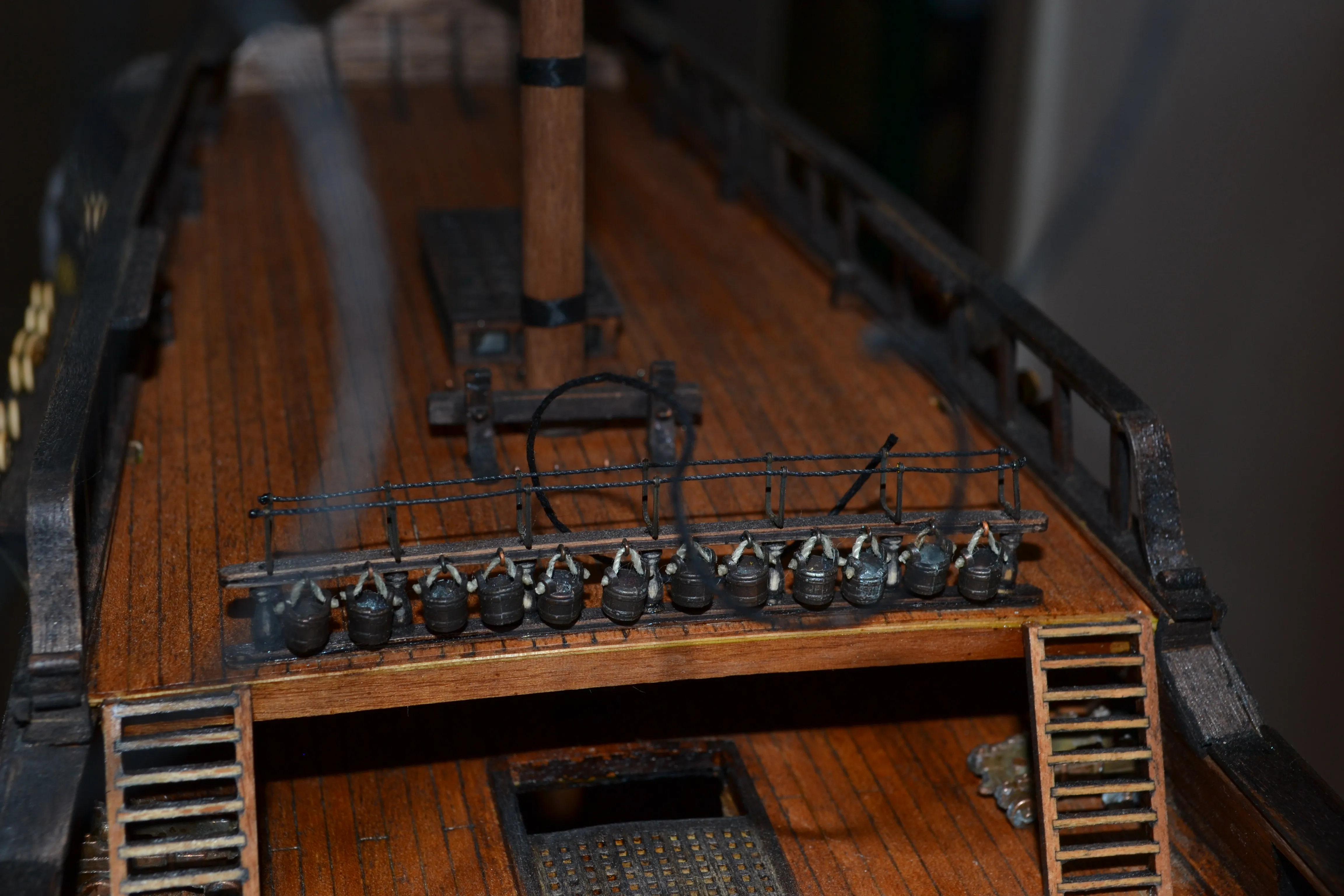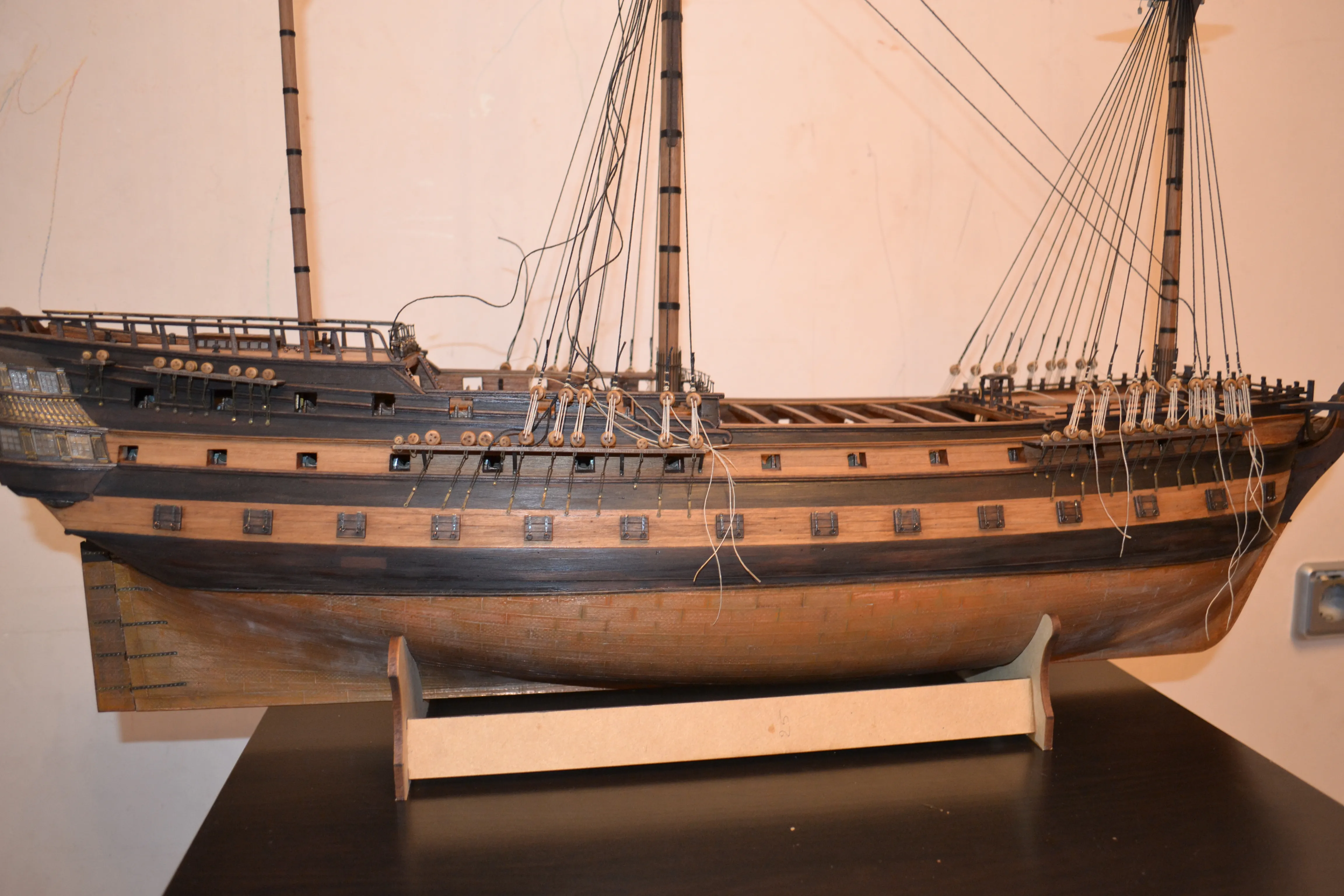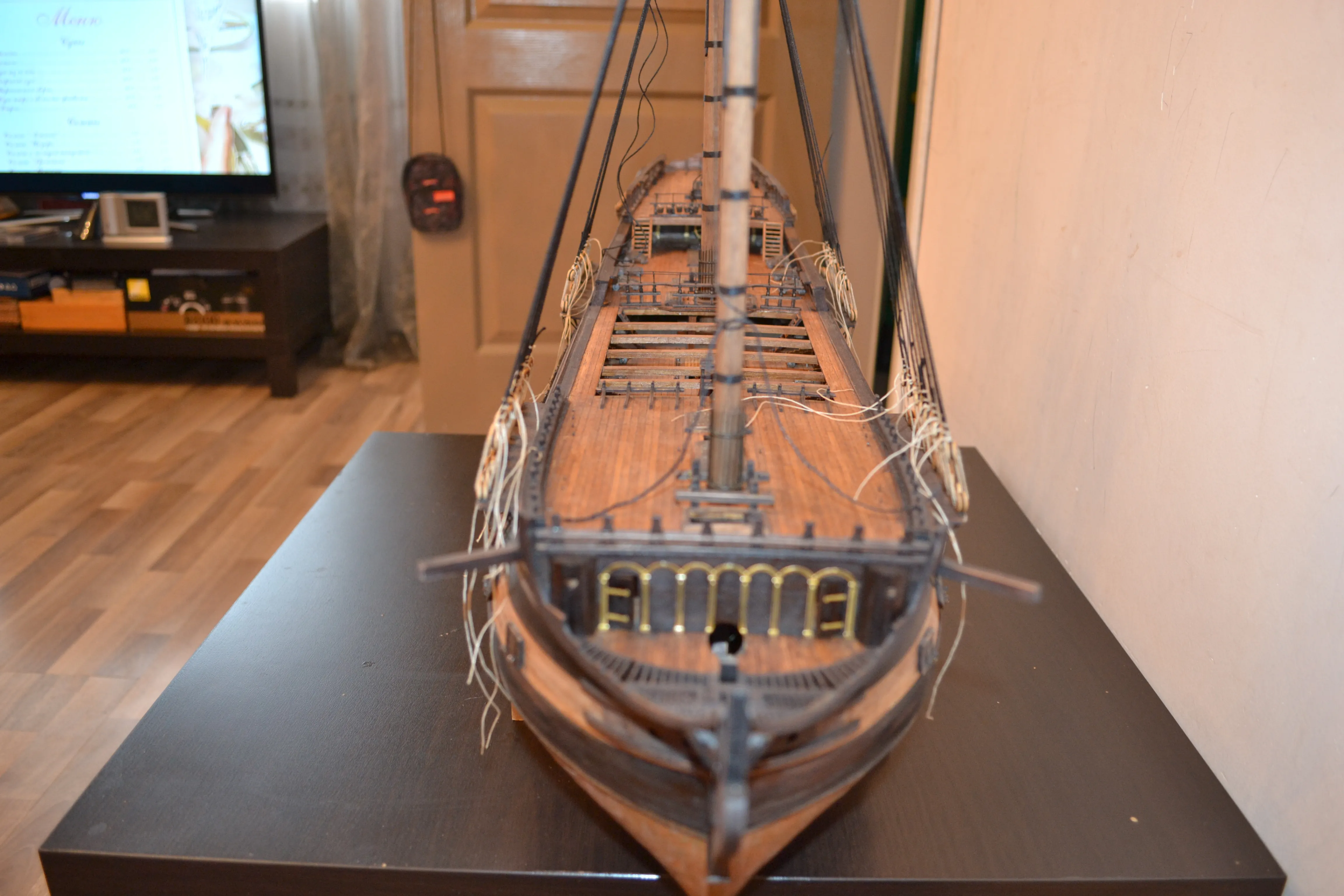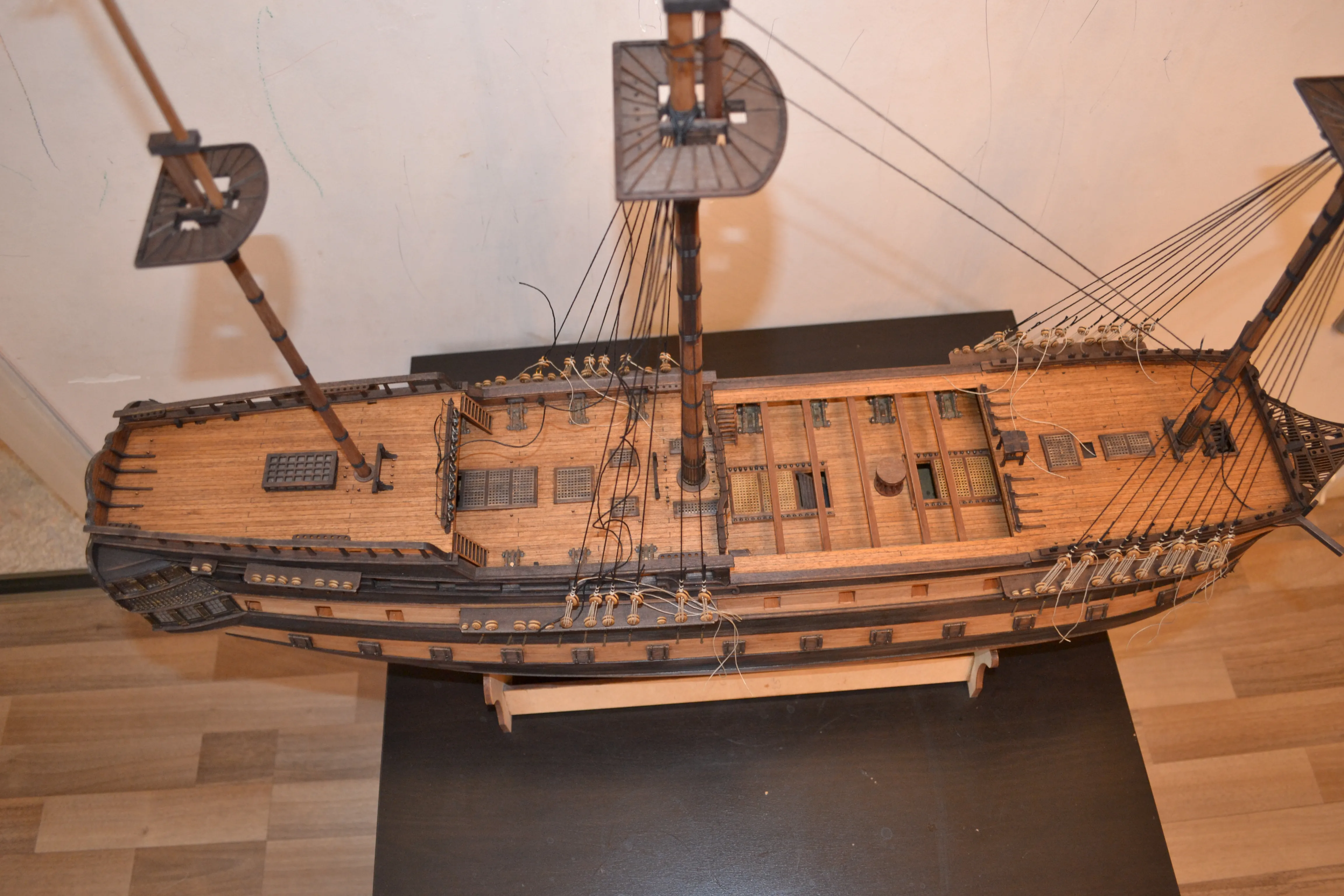 Модель из набора Амати, заменена медная обшивка для новой использовал клейкую ленту из магазина предварительно перфорировал и запатинировал. Черная обшивка из эбена. швы на палубе чернил графитом, готовые детали из набора тонировал морилкой "эбен" модель покрыл маслом тоже из магазина.