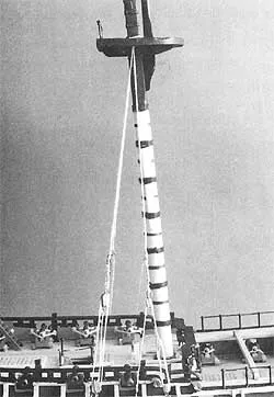 Многие из рей, как упоминалось выше, сделаны из деревянных реек-заготовок квадратного сечения. Каждая заготовка предварительно сужается от середины к концам любым известным способом, затем ребра снимаются для придания заготовке октагонального сечения. После этого размечается центральная часть и обе стороны вне этой части дополнительно обрабатываются для придания им круглого сечения (Рис. 26).