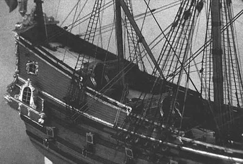 Вырезание квартер-галереи на судне семнадцатого века приводит в панику любого моделиста. Хитрость состоит в том, чтобы суметь посмотреть сквозь все блестящие резные детали и увидеть простые основные формы галерей, которые легко сделать из блоков сосны, липы и другого дерева. Кормовая квартер-галерея имела в середине изящный изгиб вверх, далее уклон и затем вновь небольшой подъем к бортам.