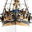 Традиционная двойная обшивка из гибкой липы и приятного темного ореха, настил палубы из танганики шириной 3 мм. Киль, штевни и перо руля выполнены лазерной резкой из цельного ореха, что не дает фанерных торцов. Также из цельного ореха даны и другие каркасные детали, торцы которых будут впоследствии видны на модели парусника. Палуба довольно плотно застроена: колокольня, труба камбуза, решетки, кран-балки на баке; пушки, трапы, решетки, специальные помпы на главной палубе; трапы, шпиль, решетки, люки, штурвал на юте. Красиво сделаны планширь и ограждения, фототравленные вант-путенсы с фиксатором, деревянные бейфуты для рей. Кормовое украшение, боковые галереи и носовая фигура даны неплохими отливками из белого металла, а декор, идущий по всему борту, дан большим листом фототравления отличного качества. Вооружение корабля состоит из 16-ти пушек на станках и 16-ти вертлюжных пушек.