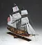 Модель корабля из дерева фирмы Corel имеет наборный корпус с двойной обшивкой, киль, шпангоуты и прочие каркасные элементы уже вырезаны и готовы к установке, так же, как и палуба. Для первой обшивки используются рейки липы, для второй – ореха. Палуба настилается рейками танганики. Все необходимые для сборки материалы и элементы даны в наборе: юферсы, блоки, латунные рымы, гвоздики, нити для проводки такелажа, круглые заготовки из рамина для рангоута, готовые детали для сборки решёток и трапа, ткань для парусов, набор флагов.
