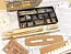 Модель корабля из дерева содержит все необходимые для постройки материалы, готовые детали или детали, которые легко делаются из прилагаемых деревянных реек или круглых заготовок. Литые металлические детали обычно из белого металла, гальванически покрытого под золото. Небольшой наборный корпус собирается из уже готовых киля и шпангоутов, имеет двухслойную обшивку из липы и ореха. А желтый пояс по фальшборту выполнен из самшита, что позволяет обойтись без применения красок на модели. Настил палубы выполняется из реек белого клена шириной 3 мм.