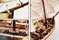 Полноценный каркас собирается из уже вырезанных лазером киля и шпангоутов, отдельными рейками выполняется настил, устанавливаются банки, выполняется малковка и затем обшивка бортов с креплением реек на клей и миниатюрные гвоздики. Обшивка двухслойная: внутри из крепких реек липы, а снаружи из тонких реек ореха. Шлифовка, полировка, покрытие лаком корпуса – и вот вы готовы устанавливать перо руля, кницы, барабан брашпиля, направляющие под якорный канат, рангоут (две мачты, бушприт и две реи), готовы натягивать такелаж из прилагаемых темных и светлых нитей, устанавливать готовые паруса из ткани. Кроме того, мы выполнили и прилагаем перевод инструкции на русский язык.