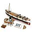 В наборе, кроме деревянных деталей, вы найдёте множество металлических элементов. Это и кнехты, и якоря, и шпили, и лебедки, и воздухозаборники, и прожектора, и иллюминаторы, и всевозможные стойки. Рулевая рубка оборудована штурвалом, приборной панелью, машинным телеграфом, столиком и скамейкой. А обе шлюпки буксира выполняются из дерева по наборному каркасу. Сразу же в комплекте с моделью вы получите гребной винт, руль, дейдвуд и качалку для рулевой машинки (потребуется при установке радиоуправления). В сборке этой модели буксира вам будет помогать пошаговая цветная фотоинструкция, где содержится 130 фотографий от закладки киля модели до установки аппаратуры управления.