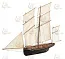 Все три мачты и все реи выполнены из темного ореха, а для такелажа используются одно- и двушкивные блоки и нити двух цветов и двух диаметров. Все десять парусов (один из них убран) даны готовыми, одновременно с этим есть их развертки, чтобы можно было изготовить паруса самостоятельно. Для модели предусмотрена подставка и держатели. Как обычно, подробная инструкция в цветных фотографиях из 32-х этапов и четыре листа полноразмерных чертежей.