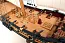 На палубах лазером нанесена разметка центральной линии и люков, что облегчает выполнение настила. В носовой части модели парусника находится брашпиль, который собирается из надетых на ось колец, а затем зашивается размеченными рейками для получения восьмигранного сечения с квадратными отверстиями. Стоит ли после этого говорить о других элементах, к которым японский изготовитель подошел столь же скрупулезно. Декор яхты состоит из множества литых украшений, латунного фототравления и вырезанных лазером деревянных элементов. Здесь стоит отметить, что в этой модели корабля фирма Woody Joe почти не применяет фанеру, все видимые детали вырезаны или изготовляются из цельного дерева. Вооружение яхты состоит из восьми литых пушек на деревянных лафетах.