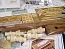 Фототравлением даны декор, световые люки, леерные стойки, крышки загрузочных портов, мелкие рымы и табличка с названием модели. А вот металлических литых деталей гораздо больше. Здесь и шлюпбалки, и бугеля, и различные стойки, штурвал, кнехты, бортовые огни, брашпиль, помпы нескольких видов, якоря, носовая фигура, трапы. Хотя литье хорошего качества, а всё же некоторые детали лучше сделать из дерева. Традиционно для рангоута прилагаются круглые заготовки, для такелажа светлые и темные нити на пяти катушках, точеные латунные нагеля, рымы и т.д.