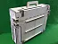 Малое переносное рабочее место моделиста выполнено в форме чемоданчика размером 53х47,5х16 см. В разложенном состоянии рабочее поле получается 50х30 см. Два выносных модуля хранятся внутри чемоданчика, а в рабочем состоянии крепятся по бокам рабочего места, как уши. В этих отсеках есть пять полочек под краски и семь полочек с отверстиями под различный стержневой инструмент и сверла. Причем отверстия под сверла выполнены разного диаметра, и они подписаны.