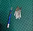 Набор из 12 плоских алмазных надфилей шириной 6, 4 и 2 мм. Надфиля каждой ширины представлены четырьмя разновидностями, отличающимися зернистостью: 120, 180, 300 и 400 грит. Длина рабочей поверхности алмазных надфилей составляет 30 мм, полная длина сменного надфиля 70 мм. Алюминиевая рукоятка длиной 120 мм и диаметром около 10 мм имеет латунную цангу для фиксации надфилей и клипсу как у шариковых ручек, чтобы закрепить ее в кармане пиджака или рубашки.