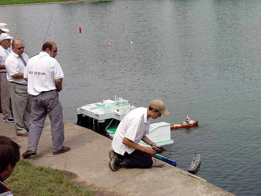 Чемпионат проходил на пруду в парке Дружбы у метро 'Речной вокзал' с 30 июля по 5 августа 2004 года. Участвовали команды Белоруссии, Казахстана, Польши, России, Украины, Чехии. Протоколы чемпионата вы можете найти на сайте NAVIGA. Морской старт. Запуск космических аппаратов экономичнее всего производит с экваториальной области, так как при этом максимально используется естественное ускорение за счет вращения Земли. Именно для этого разрабатываются комплексы для морского старта ракет. В данном примере первым на боевое охранение выходит военный корабль, который помечает место старта двумя буями. Затем пусковая платформа и судно технической поддержки выходят в точку запуска. Выдвигается и поднимается платформа с ракетой и происходит старт. Небольшой видеофрагмент (2Mb) момента подъема и старта ракеты. Обратите внимание на слова диктора после старта: 'Сейчас вас будет поздравлять Президент'. Затем звучит поздравления Президента с успешным стартом!
