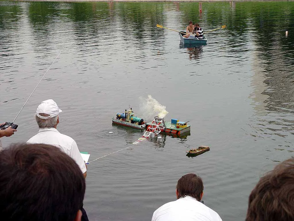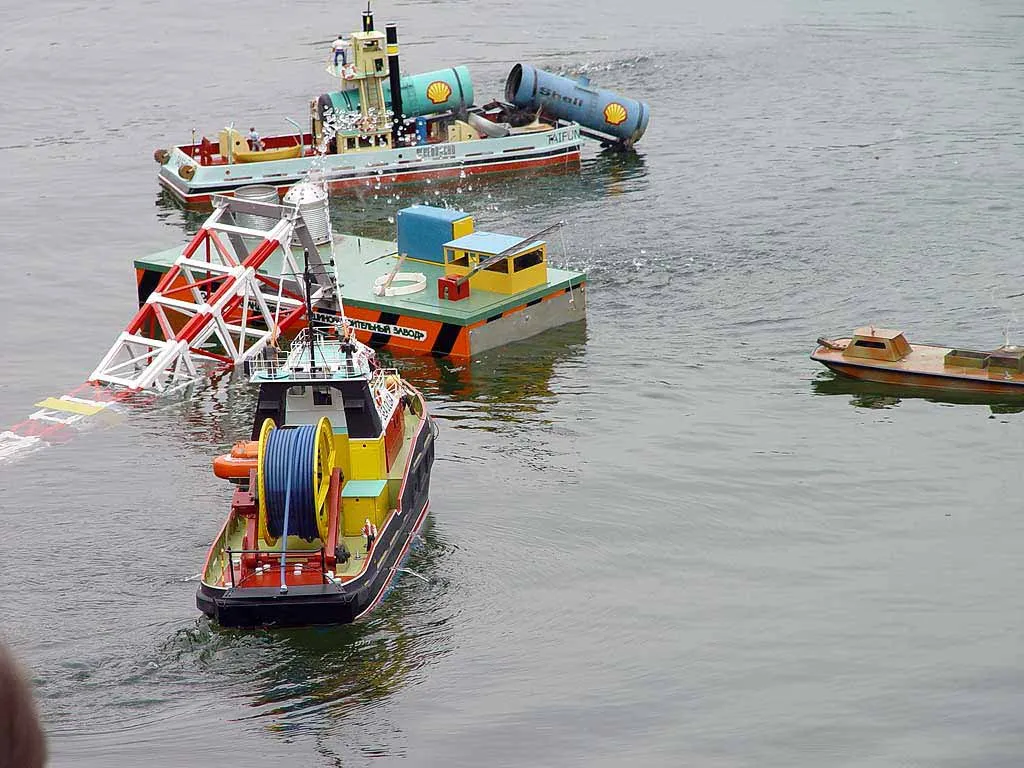 Чемпионат проходил на пруду в парке Дружбы у метро 'Речной вокзал' с 30 июля по 5 августа 2004 года. Участвовали команды Белоруссии, Казахстана, Польши, России, Украины, Чехии. Протоколы чемпионата вы можете найти на сайте NAVIGA. Выступление российской команды тоже было на тему терроризма. Судно с террористами нападает на буровую платформу и на судно сопровождения. Затем само получает повреждения и загорается. Платформу тушит пожарный катер, а спасательное судно чинит платформу и судно сопровождения, заодно вылавливая из воды потерявшиеся во время теракта элементы |