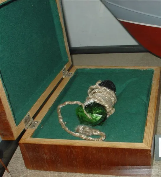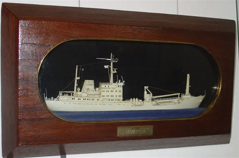 Н. Жукович Катер рыбоохраны М 1:24. Полистирол, стеклопластик |  Жигальский А. ТНТ "Пинега" М 1:470. Полистирол |  Горлышко бутылки шампанского, разбитого о корпус ТНТ "Пинега" при спуске на воду |