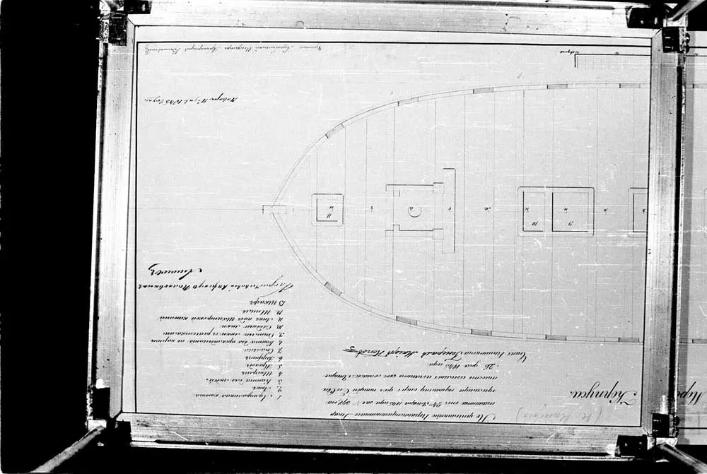 Опер-дек палуба 24-х пушечного фрегата для Морского Корпуса. 1845 год. |  Опер-дек палуба 24-х пушечного фрегата для Морского Корпуса. 1845 год. |  Чертеж юта и форкастеля 24-х пушечного фрегата для Морского Корпуса. 1845 год. |
