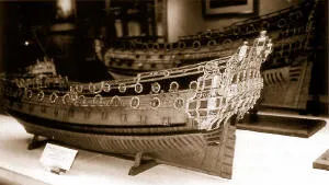 St. George Крупный план правого борта носовой части, видна носовая фигура: Святой Георг и дракон. Английский 96-ти пушечный корабль второго ранга, 1701 год. Масштаб 1:48, длина 1450 мм, высота 1320 мм, ширина 630 мм. Эта единственная модель во всем собрании, которая имеет первоначальный (подлинный) такелаж 1701 года. Британские военно-морские историки полагают, что это одна из четырех самых ценных моделей коллекции. |