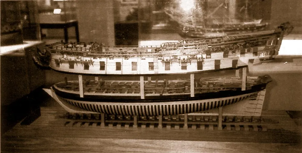 Неизвестный английский 66-ти пушечный корабль третьего ранга, примерно 1714 год. Масштаб 1:48, длина 1170 мм, высота 480 мм, ширина 260 мм. Обратите внимание: верхняя часть модели приподнята, чтобы показать внутреннюю структуру, детали и шпиль. |
