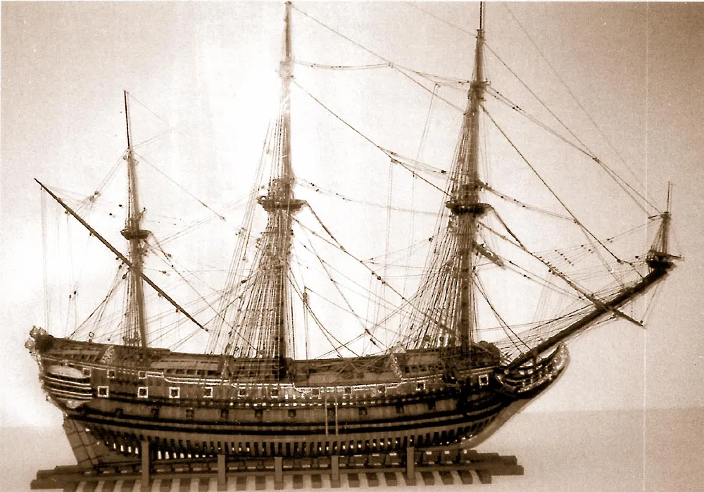 Неизвестный английский 66-ти пушечный корабль четвертого ранга, 1710 год. Масштаб примерно 1:42, длина 990 мм, высота 330 мм, ширина 230 мм. |