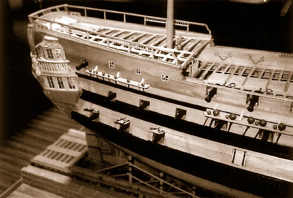 Предыдущая модель, вид на корму показывает двойную квартергалерею, одинарную кормовую галерею, кормовой орнамент в виде двух купидонов, держащих щит с монограммой GR (Georgius Rex: король Георг II), двух облокотившихся купидонов с каждого борта и три кормовых фонаря. |