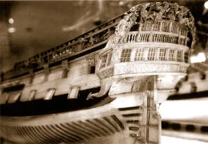 Princess Royal Британский 100 пушечный корабль, примерно 1773 год. Масштаб 1:48, длина 1400 мм, высота 460 мм, ширина 330 мм. Носовая фигура поддерживается с левого борта фигурой Нептуна, а с правого борта женской фигурой. Нижняя часть гальюна и княвдигед украшены купидонами. Носовая переборка несет на себе изображения захваченных трофеев. |