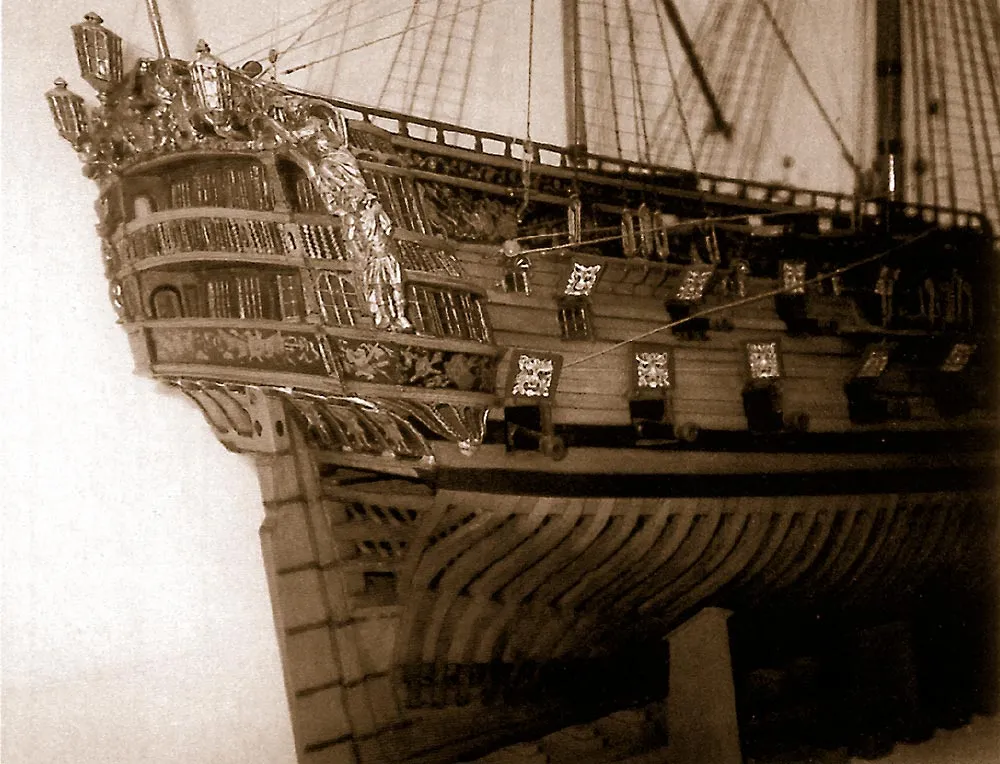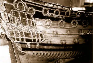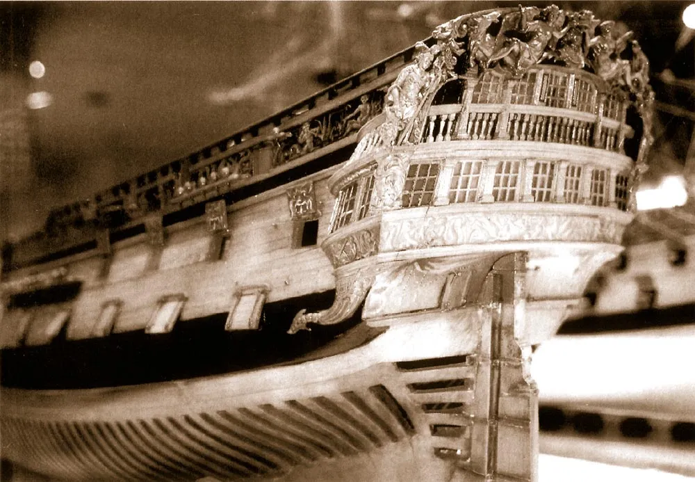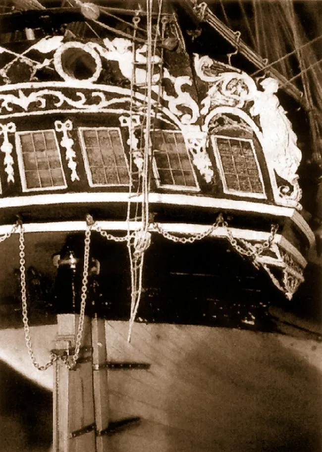 Предыдущая модель, вид на корму показывает богатую резьбу транца и пилястров. Обратите внимание на необычные, в виде изогнутой капли, нижние окончания квартергалереи. |