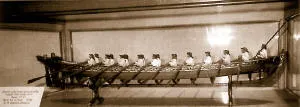 Chesapeake Эта модель была специально заказана для подарка капитану Филиппу Бруку (Phillip Broke) после захвата Chesapeake. Полковник Роджерс выкупил эту модель у одного из потомков Брука, лорда Willoughby de Broke. На этой фотографии показана корма корабля, галерея, украшения в виде скрещенных флагов и двух купидонов с обеих сторон, спущенный веревочный трап, цепные штур-тросы руля, прорез на пере руля и два пушечных порта в корме. |